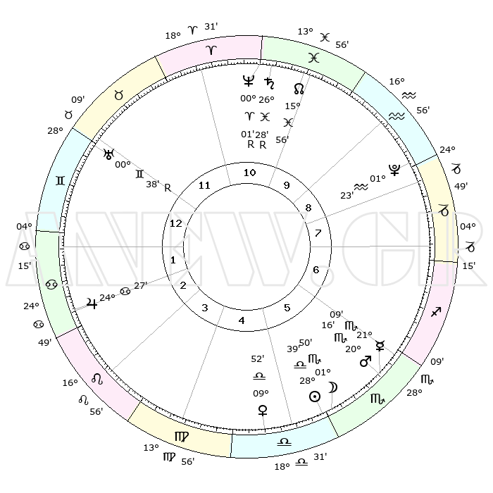 | ΘΕΣΕΙΣ ΠΛΑΝΗΤΩΝ ΑΣΤΡΟΛΟΓΙΚΟΥ ΧΑΡΤΗ ΤΗΣ ΣΤΙΓΜΗΣ ΑΥΤΗΣ | | Πλανήτης | Ζώδιο | Μοίρες | Δεκαήμ. | Σε οίκο | Απόκλιση | | Ακμές των οίκων | Ηλιος | Ζυγός | 28°18' | Τρίτο | 9 | 10 S 52 | | 1ος | 16°11' | Αιγόκερως | Σελήνη | Ζυγός | 27°34' | Τρίτο | 9 | 13 S 41 | | 2ος | 27°26' | Υδροχόος | Ερμής | Σκορπιός | 20°42' | Τρίτο | 10 | 20 S 12 | | 3ος | 07°28' | Κριός | Αφροδίτη | Ζυγός | 09°25' | Πρώτο | 9 | 02 S 19 | | 4ος | 08°29' | Ταύρος | Αρης | Σκορπιός | 20°01' | Τρίτο | 10 | 18 S 01 | | 5ος | 02°33' | Δίδυμοι | Δίας | Καρκίνος | 24°25' | Τρίτο | 7 | 21 N 17 | | 6ος | 23°46' | Δίδυμοι | Κρόνος | Ιχθείς | 26°29'R | Τρίτο | 2 | 03 S 41 | | 7ος | 16°11' | Καρκίνος | Ουρανός | Δίδυμοι | 00°39'R | Πρώτο | 4 | 20 N 05 | | 8ος | 27°26' | Λέων | Ποσειδώνας | Κριός | 00°01'R | Πρώτο | 2 | 01 S 15 | | 9ος | 07°28' | Ζυγός | Πλούτωνας | Υδροχόος | 01°23' | Πρώτο | 1 | 23 S 32 | | 10ος | 08°29' | Σκορπιός | Β. Δεσμός | Ιχθείς | 15°57' | Δεύτερο | 2 | 05 S 32 | | 11ος | 02°33' | Τοξότης | Ωροσκόπος | Αιγόκερως | 16°11' | Δεύτερο | | | 12ος | 23°46' | Τοξότης | Μεσουράνημα | Σκορπιός | 08°29' | Πρώτο | | | |