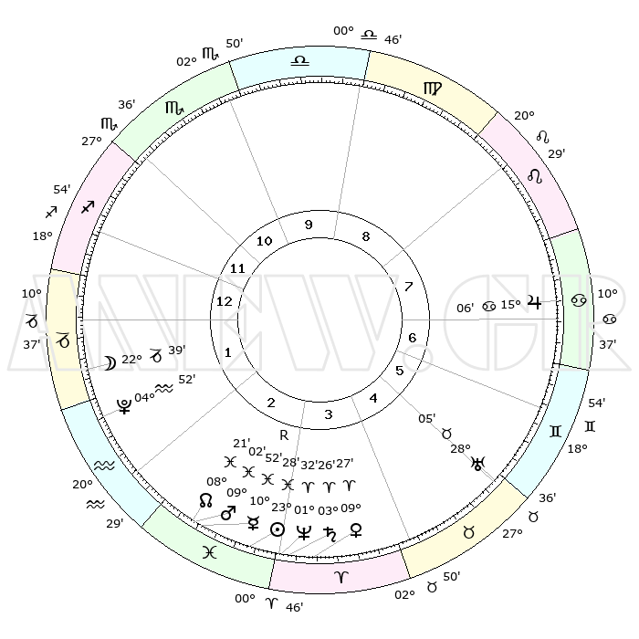 | | ΘΕΣΕΙΣ ΠΛΑΝΗΤΩΝ ΑΣΤΡΟΛΟΓΙΚΟΥ ΧΑΡΤΗ ΤΗΣ ΣΤΙΓΜΗΣ ΑΥΤΗΣ | | | | Πλανήτης | Ζώδιο | Μοίρες | Δεκαήμ. | Σε οίκο | Απόκλιση | | Ακμές των οίκων | | Ηλιος | Ιχθείς | 23°24' | Τρίτο | 3 | 02 S 37 | | 1ος | 19°25' | Τοξότης | | Σελήνη | Αιγόκερως | 21°52' | Τρίτο | 1 | 25 S 28 | | 2ος | 24°02' | Αιγόκερως | | Ερμής | Ιχθείς | 10°54'R | Δεύτερο | 3 | 05 S 01 | | 3ος | 02°54' | Ιχθείς | | Αφροδίτη | Κριός | 09°22' | Πρώτο | 4 | 02 N 43 | | 4ος | 08°14' | Κριός | | Αρης | Ιχθείς | 08°59' | Πρώτο | 3 | 09 S 13 | | 5ος | 06°18' | Ταύρος | | Δίας | Καρκίνος | 15°06' | Δεύτερο | 7 | 22 N 56 | | 6ος | 28°59' | Ταύρος | | Κρόνος | Κριός | 03°25' | Πρώτο | 3 | 00 S 36 | | 7ος | 19°25' | Δίδυμοι | | Ουρανός | Ταύρος | 28°05' | Τρίτο | 5 | 19 N 33 | | 8ος | 24°02' | Καρκίνος | | Ποσειδώνας | Κριός | 01°32' | Πρώτο | 3 | 00 S 35 | | 9ος | 02°54' | Παρθένος | | Πλούτωνας | Υδροχόος | 04°52' | Πρώτο | 2 | 22 S 50 | | 10ος | 08°14' | Ζυγός | | Β. Δεσμός | Ιχθείς | 08°21' | Πρώτο | 3 | 08 S 26 | | 11ος | 06°18' | Σκορπιός | | Ωροσκόπος | Τοξότης | 19°25' | Δεύτερο | | | 12ος | 28°59' | Σκορπιός | | Μεσουράνημα | Ζυγός | 08°14' | Πρώτο | | | |