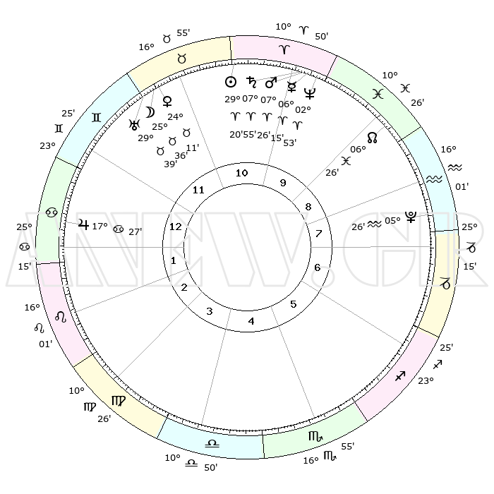 | | ΘΕΣΕΙΣ ΠΛΑΝΗΤΩΝ ΑΣΤΡΟΛΟΓΙΚΟΥ ΧΑΡΤΗ ΤΗΣ ΣΤΙΓΜΗΣ ΑΥΤΗΣ | | | | Πλανήτης | Ζώδιο | Μοίρες | Δεκαήμ. | Σε οίκο | Απόκλιση | | Ακμές των οίκων | | Ηλιος | Κριός | 29°16' | Τρίτο | 11 | 11 N 13 | | 1ος | 04°51' | Καρκίνος | | Σελήνη | Ταύρος | 24°37' | Τρίτο | 11 | 23 N 44 | | 2ος | 25°25' | Καρκίνος | | Ερμής | Κριός | 06°09' | Πρώτο | 10 | 00 N 02 | | 3ος | 17°34' | Λέων | | Αφροδίτη | Ταύρος | 24°06' | Τρίτο | 11 | 19 N 09 | | 4ος | 14°40' | Παρθένος | | Αρης | Κριός | 07°23' | Πρώτο | 10 | 02 N 03 | | 5ος | 19°20' | Ζυγός | | Δίας | Καρκίνος | 17°26' | Δεύτερο | 1 | 22 N 41 | | 6ος | 28°54' | Σκορπιός | | Κρόνος | Κριός | 07°54' | Πρώτο | 10 | 01 N 09 | | 7ος | 04°51' | Αιγόκερως | | Ουρανός | Ταύρος | 29°39' | Τρίτο | 12 | 19 N 54 | | 8ος | 25°25' | Αιγόκερως | | Ποσειδώνας | Κριός | 02°53' | Πρώτο | 10 | 00 S 04 | | 9ος | 17°34' | Υδροχόος | | Πλούτωνας | Υδροχόος | 05°26' | Πρώτο | 8 | 22 S 48 | | 10ος | 14°40' | Ιχθείς | | Β. Δεσμός | Ιχθείς | 06°26' | Πρώτο | 9 | 09 S 09 | | 11ος | 19°20' | Κριός | | Ωροσκόπος | Καρκίνος | 04°51' | Πρώτο | | | 12ος | 28°54' | Ταύρος | | Μεσουράνημα | Ιχθείς | 14°40' | Δεύτερο | | | |