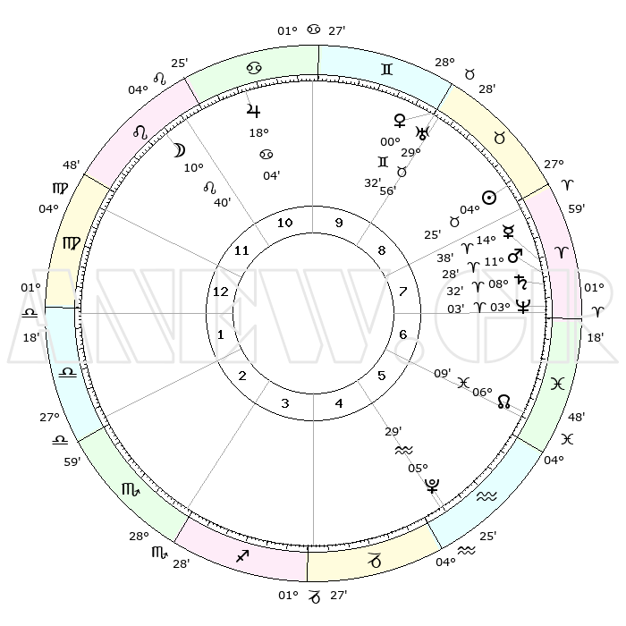 | | ΘΕΣΕΙΣ ΠΛΑΝΗΤΩΝ ΑΣΤΡΟΛΟΓΙΚΟΥ ΧΑΡΤΗ ΤΗΣ ΣΤΙΓΜΗΣ ΑΥΤΗΣ | | | | Πλανήτης | Ζώδιο | Μοίρες | Δεκαήμ. | Σε οίκο | Απόκλιση | | Ακμές των οίκων | | Ηλιος | Ταύρος | 04°22' | Πρώτο | 8 | 12 N 58 | | 1ος | 12°41' | Παρθένος | | Σελήνη | Λέων | 09°49' | Πρώτο | 11 | 20 N 04 | | 2ος | 07°49' | Ζυγός | | Ερμής | Κριός | 14°31' | Δεύτερο | 8 | 03 N 27 | | 3ος | 07°27' | Σκορπιός | | Αφροδίτη | Δίδυμοι | 00°27' | Πρώτο | 9 | 20 N 50 | | 4ος | 10°23' | Τοξότης | | Αρης | Κριός | 11°25' | Δεύτερο | 8 | 03 N 40 | | 5ος | 13°51' | Αιγόκερως | | Δίας | Καρκίνος | 18°04' | Δεύτερο | 11 | 22 N 36 | | 6ος | 15°00' | Υδροχόος | | Κρόνος | Κριός | 08°31' | Πρώτο | 8 | 01 N 24 | | 7ος | 12°41' | Ιχθείς | | Ουρανός | Ταύρος | 29°55' | Τρίτο | 9 | 19 N 58 | | 8ος | 07°49' | Κριός | | Ποσειδώνας | Κριός | 03°03' | Πρώτο | 7 | 00 N 00 | | 9ος | 07°27' | Ταύρος | | Πλούτωνας | Υδροχόος | 05°29' | Πρώτο | 5 | 22 S 48 | | 10ος | 10°23' | Δίδυμοι | | Β. Δεσμός | Ιχθείς | 06°09' | Πρώτο | 6 | 09 S 15 | | 11ος | 13°51' | Καρκίνος | | Ωροσκόπος | Παρθένος | 12°41' | Δεύτερο | | | 12ος | 15°00' | Λέων | | Μεσουράνημα | Δίδυμοι | 10°23' | Δεύτερο | | | |