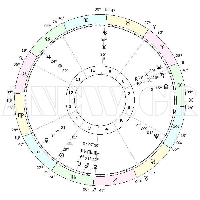 | ΘΕΣΕΙΣ ΠΛΑΝΗΤΩΝ ΑΣΤΡΟΛΟΓΙΚΟΥ ΧΑΡΤΗ ΤΗΣ ΣΤΙΓΜΗΣ ΑΥΤΗΣ | | Πλανήτης | Ζώδιο | Μοίρες | Δεκαήμ. | Σε οίκο | Απόκλιση | | Ακμές των οίκων | Ηλιος | Ζυγός | 29°44' | Τρίτο | 4 | 11 S 23 | | 1ος | 02°38' | Λέων | Σελήνη | Σκορπιός | 14°49' | Δεύτερο | 4 | 20 S 24 | | 2ος | 23°51' | Λέων | Ερμής | Σκορπιός | 22°31' | Τρίτο | 4 | 20 S 47 | | 3ος | 19°15' | Παρθένος | Αφροδίτη | Ζυγός | 11°13' | Δεύτερο | 3 | 03 S 01 | | 4ος | 20°36' | Ζυγός | Αρης | Σκορπιός | 21°02' | Τρίτο | 4 | 18 S 18 | | 5ος | 26°34' | Σκορπιός | Δίας | Καρκίνος | 24°31' | Τρίτο | 12 | 21 N 17 | | 6ος | 01°51' | Αιγόκερως | Κρόνος | Ιχθείς | 26°24'R | Τρίτο | 9 | 03 S 43 | | 7ος | 02°38' | Υδροχόος | Ουρανός | Δίδυμοι | 00°36'R | Πρώτο | 11 | 20 N 04 | | 8ος | 23°51' | Υδροχόος | Ποσειδώνας | Ιχθείς | 29°59'R | Τρίτο | 9 | 01 S 16 | | 9ος | 19°15' | Ιχθείς | Πλούτωνας | Υδροχόος | 01°23' | Πρώτο | 6 | 23 S 32 | | 10ος | 20°36' | Κριός | Β. Δεσμός | Ιχθείς | 15°53' | Δεύτερο | 8 | 05 S 34 | | 11ος | 26°34' | Ταύρος | Ωροσκόπος | Λέων | 02°38' | Πρώτο | | | 12ος | 01°51' | Καρκίνος | Μεσουράνημα | Κριός | 20°36' | Τρίτο | | | |
