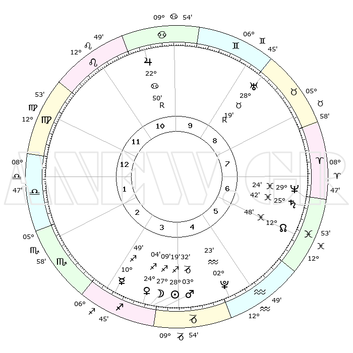 | | ΘΕΣΕΙΣ ΠΛΑΝΗΤΩΝ ΑΣΤΡΟΛΟΓΙΚΟΥ ΧΑΡΤΗ ΤΗΣ ΣΤΙΓΜΗΣ ΑΥΤΗΣ | | | | Πλανήτης | Ζώδιο | Μοίρες | Δεκαήμ. | Σε οίκο | Απόκλιση | | Ακμές των οίκων | | Ηλιος | Τοξότης | 28°15' | Τρίτο | 4 | 23 S 25 | | 1ος | 19°33' | Παρθένος | | Σελήνη | Τοξότης | 26°22' | Τρίτο | 4 | 28 S 14 | | 2ος | 15°18' | Ζυγός | | Ερμής | Τοξότης | 10°43' | Δεύτερο | 3 | 21 S 09 | | 3ος | 15°18' | Σκορπιός | | Αφροδίτη | Τοξότης | 23°59' | Τρίτο | 4 | 23 S 20 | | 4ος | 18°13' | Τοξότης | | Αρης | Αιγόκερως | 03°29' | Πρώτο | 4 | 24 S 12 | | 5ος | 21°25' | Αιγόκερως | | Δίας | Καρκίνος | 22°50'R | Τρίτο | 11 | 21 N 42 | | 6ος | 22°16' | Υδροχόος | | Κρόνος | Ιχθείς | 25°42' | Τρίτο | 7 | 03 S 49 | | 7ος | 19°33' | Ιχθείς | | Ουρανός | Ταύρος | 28°19'R | Τρίτο | 9 | 19 N 35 | | 8ος | 15°18' | Κριός | | Ποσειδώνας | Ιχθείς | 29°24' | Τρίτο | 7 | 01 S 28 | | 9ος | 15°18' | Ταύρος | | Πλούτωνας | Υδροχόος | 02°22' | Πρώτο | 5 | 23 S 18 | | 10ος | 18°13' | Δίδυμοι | | Β. Δεσμός | Ιχθείς | 12°49' | Δεύτερο | 6 | 06 S 45 | | 11ος | 21°25' | Καρκίνος | | Ωροσκόπος | Παρθένος | 19°33' | Δεύτερο | | | 12ος | 22°16' | Λέων | | Μεσουράνημα | Δίδυμοι | 18°13' | Δεύτερο | | | |