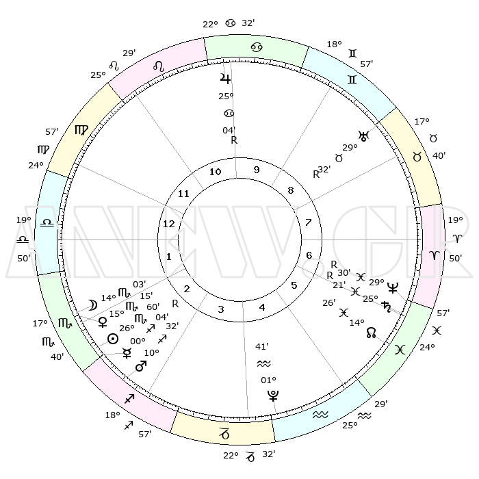 | | ΘΕΣΕΙΣ ΠΛΑΝΗΤΩΝ ΑΣΤΡΟΛΟΓΙΚΟΥ ΧΑΡΤΗ ΤΗΣ ΣΤΙΓΜΗΣ ΑΥΤΗΣ | | | | Πλανήτης | Ζώδιο | Μοίρες | Δεκαήμ. | Σε οίκο | Απόκλιση | | Ακμές των οίκων | | Ηλιος | Σκορπιός | 26°57' | Τρίτο | 2 | 19 S 28 | | 1ος | 04°31' | Ζυγός | | Σελήνη | Σκορπιός | 13°26' | Δεύτερο | 2 | 19 S 55 | | 2ος | 01°25' | Σκορπιός | | Ερμής | Τοξότης | 00°08'R | Πρώτο | 2 | 20 S 06 | | 3ος | 02°01' | Τοξότης | | Αφροδίτη | Σκορπιός | 15°11' | Δεύτερο | 2 | 15 S 20 | | 4ος | 05°04' | Αιγόκερως | | Αρης | Τοξότης | 10°30' | Δεύτερο | 3 | 22 S 34 | | 5ος | 08°01' | Υδροχόος | | Δίας | Καρκίνος | 25°04'R | Τρίτο | 10 | 21 N 14 | | 6ος | 08°16' | Ιχθείς | | Κρόνος | Ιχθείς | 25°21'R | Τρίτο | 6 | 04 S 03 | | 7ος | 04°31' | Κριός | | Ουρανός | Ταύρος | 29°33'R | Τρίτο | 8 | 19 N 51 | | 8ος | 01°25' | Ταύρος | | Ποσειδώνας | Ιχθείς | 29°30'R | Τρίτο | 6 | 01 S 27 | | 9ος | 02°01' | Δίδυμοι | | Πλούτωνας | Υδροχόος | 01°41' | Πρώτο | 4 | 23 S 27 | | 10ος | 05°04' | Καρκίνος | | Β. Δεσμός | Ιχθείς | 14°27' | Δεύτερο | 6 | 06 S 07 | | 11ος | 08°01' | Λέων | | Ωροσκόπος | Ζυγός | 04°31' | Πρώτο | | | 12ος | 08°16' | Παρθένος | | Μεσουράνημα | Καρκίνος | 05°04' | Πρώτο | | | |