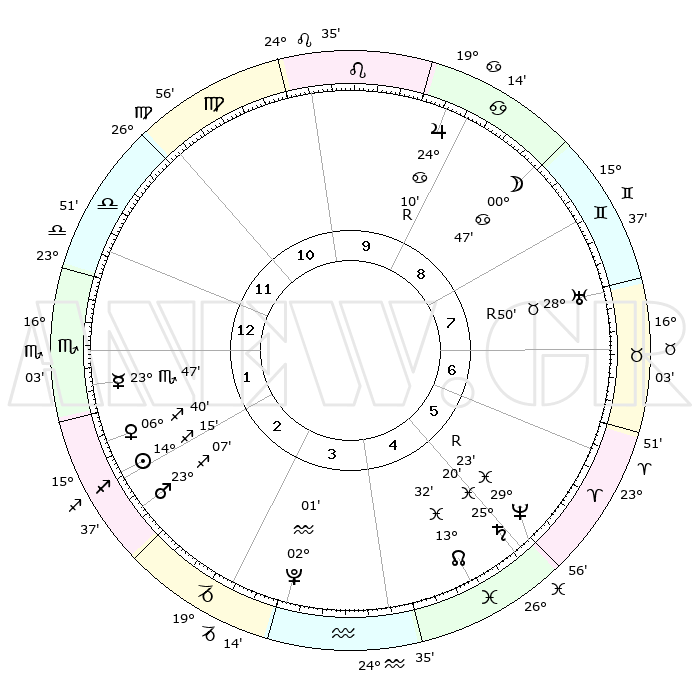 | | ΘΕΣΕΙΣ ΠΛΑΝΗΤΩΝ ΑΣΤΡΟΛΟΓΙΚΟΥ ΧΑΡΤΗ ΤΗΣ ΣΤΙΓΜΗΣ ΑΥΤΗΣ | | | | Πλανήτης | Ζώδιο | Μοίρες | Δεκαήμ. | Σε οίκο | Απόκλιση | | Ακμές των οίκων | | Ηλιος | Τοξότης | 14°11' | Δεύτερο | 2 | 22 S 30 | | 1ος | 27°07' | Ζυγός | | Σελήνη | Δίδυμοι | 29°48' | Τρίτο | 9 | 28 N 14 | | 2ος | 25°21' | Σκορπιός | | Ερμής | Σκορπιός | 23°43' | Τρίτο | 1 | 16 S 18 | | 3ος | 27°05' | Τοξότης | | Αφροδίτη | Τοξότης | 06°35' | Πρώτο | 2 | 20 S 54 | | 4ος | 01°05' | Υδροχόος | | Αρης | Τοξότης | 23°04' | Τρίτο | 2 | 23 S 57 | | 5ος | 04°02' | Ιχθείς | | Δίας | Καρκίνος | 24°10'R | Τρίτο | 9 | 21 N 27 | | 6ος | 02°57' | Κριός | | Κρόνος | Ιχθείς | 25°20' | Τρίτο | 5 | 04 S 01 | | 7ος | 27°07' | Κριός | | Ουρανός | Ταύρος | 28°50'R | Τρίτο | 8 | 19 N 42 | | 8ος | 25°21' | Ταύρος | | Ποσειδώνας | Ιχθείς | 29°23'R | Τρίτο | 5 | 01 S 29 | | 9ος | 27°05' | Δίδυμοι | | Πλούτωνας | Υδροχόος | 02°01' | Πρώτο | 4 | 23 S 22 | | 10ος | 01°05' | Λέων | | Β. Δεσμός | Ιχθείς | 13°33' | Δεύτερο | 5 | 06 S 28 | | 11ος | 04°02' | Παρθένος | | Ωροσκόπος | Ζυγός | 27°07' | Τρίτο | | | 12ος | 02°57' | Ζυγός | | Μεσουράνημα | Λέων | 01°05' | Πρώτο | | | |