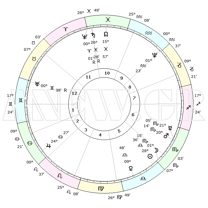 | ΘΕΣΕΙΣ ΠΛΑΝΗΤΩΝ ΑΣΤΡΟΛΟΓΙΚΟΥ ΧΑΡΤΗ ΤΗΣ ΣΤΙΓΜΗΣ ΑΥΤΗΣ | | Πλανήτης | Ζώδιο | Μοίρες | Δεκαήμ. | Σε οίκο | Απόκλιση | | Ακμές των οίκων | Ηλιος | Ζυγός | 28°15' | Τρίτο | 10 | 10 S 51 | | 1ος | 28°28' | Τοξότης | Σελήνη | Ζυγός | 26°58' | Τρίτο | 10 | 13 S 25 | | 2ος | 05°13' | Υδροχόος | Ερμής | Σκορπιός | 20°38' | Τρίτο | 11 | 20 S 10 | | 3ος | 15°06' | Ιχθείς | Αφροδίτη | Ζυγός | 09°21' | Πρώτο | 9 | 02 S 18 | | 4ος | 19°17' | Κριός | Αρης | Σκορπιός | 19°59' | Δεύτερο | 11 | 18 S 01 | | 5ος | 15°51' | Ταύρος | Δίας | Καρκίνος | 24°25' | Τρίτο | 7 | 21 N 17 | | 6ος | 07°45' | Δίδυμοι | Κρόνος | Ιχθείς | 26°29'R | Τρίτο | 3 | 03 S 41 | | 7ος | 28°28' | Δίδυμοι | Ουρανός | Δίδυμοι | 00°39'R | Πρώτο | 5 | 20 N 05 | | 8ος | 05°13' | Λέων | Ποσειδώνας | Κριός | 00°01'R | Πρώτο | 3 | 01 S 15 | | 9ος | 15°06' | Παρθένος | Πλούτωνας | Υδροχόος | 01°23' | Πρώτο | 1 | 23 S 32 | | 10ος | 19°17' | Ζυγός | Β. Δεσμός | Ιχθείς | 15°58' | Δεύτερο | 3 | 05 S 32 | | 11ος | 15°51' | Σκορπιός | Ωροσκόπος | Τοξότης | 28°28' | Τρίτο | | | 12ος | 07°45' | Τοξότης | Μεσουράνημα | Ζυγός | 19°17' | Δεύτερο | | | |