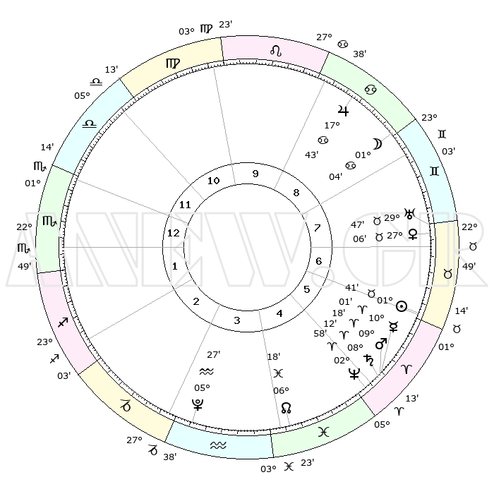 | | ΘΕΣΕΙΣ ΠΛΑΝΗΤΩΝ ΑΣΤΡΟΛΟΓΙΚΟΥ ΧΑΡΤΗ ΤΗΣ ΣΤΙΓΜΗΣ ΑΥΤΗΣ | | | | Πλανήτης | Ζώδιο | Μοίρες | Δεκαήμ. | Σε οίκο | Απόκλιση | | Ακμές των οίκων | | Ηλιος | Ταύρος | 01°37' | Πρώτο | 6 | 12 N 02 | | 1ος | 03°18' | Σκορπιός | | Σελήνη | Καρκίνος | 00°05' | Πρώτο | 8 | 28 N 08 | | 2ος | 01°55' | Τοξότης | | Ερμής | Κριός | 09°54' | Πρώτο | 6 | 01 N 33 | | 3ος | 04°09' | Αιγόκερως | | Αφροδίτη | Ταύρος | 27°01' | Τρίτο | 7 | 19 N 57 | | 4ος | 08°34' | Υδροχόος | | Αρης | Κριός | 09°14' | Πρώτο | 5 | 02 N 47 | | 5ος | 11°26' | Ιχθείς | | Δίας | Καρκίνος | 17°43' | Δεύτερο | 9 | 22 N 38 | | 6ος | 09°48' | Κριός | | Κρόνος | Κριός | 08°11' | Πρώτο | 5 | 01 N 16 | | 7ος | 03°18' | Ταύρος | | Ουρανός | Ταύρος | 29°46' | Τρίτο | 7 | 19 N 56 | | 8ος | 01°55' | Δίδυμοι | | Ποσειδώνας | Κριός | 02°57' | Πρώτο | 5 | 00 S 02 | | 9ος | 04°09' | Καρκίνος | | Πλούτωνας | Υδροχόος | 05°27' | Πρώτο | 3 | 22 S 48 | | 10ος | 08°34' | Λέων | | Β. Δεσμός | Ιχθείς | 06°18' | Πρώτο | 4 | 09 S 12 | | 11ος | 11°26' | Παρθένος | | Ωροσκόπος | Σκορπιός | 03°18' | Πρώτο | | | 12ος | 09°48' | Ζυγός | | Μεσουράνημα | Λέων | 08°34' | Πρώτο | | | |