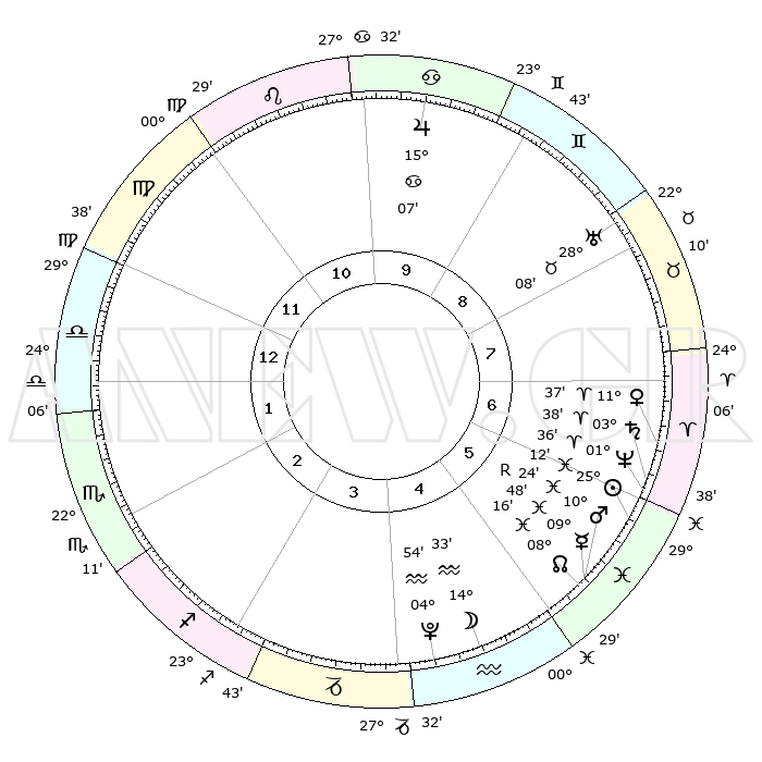 | | ΘΕΣΕΙΣ ΠΛΑΝΗΤΩΝ ΑΣΤΡΟΛΟΓΙΚΟΥ ΧΑΡΤΗ ΤΗΣ ΣΤΙΓΜΗΣ ΑΥΤΗΣ | | | | Πλανήτης | Ζώδιο | Μοίρες | Δεκαήμ. | Σε οίκο | Απόκλιση | | Ακμές των οίκων | | Ηλιος | Ιχθείς | 25°09' | Τρίτο | 6 | 01 S 56 | | 1ος | 07°35' | Ζυγός | | Σελήνη | Υδροχόος | 13°49' | Δεύτερο | 5 | 18 S 49 | | 2ος | 04°42' | Σκορπιός | | Ερμής | Ιχθείς | 09°50'R | Πρώτο | 5 | 05 S 48 | | 3ος | 05°25' | Τοξότης | | Αφροδίτη | Κριός | 11°32' | Δεύτερο | 7 | 03 N 37 | | 4ος | 08°32' | Αιγόκερως | | Αρης | Ιχθείς | 10°21' | Δεύτερο | 5 | 08 S 41 | | 5ος | 11°28' | Υδροχόος | | Δίας | Καρκίνος | 15°07' | Δεύτερο | 10 | 22 N 56 | | 6ος | 11°36' | Ιχθείς | | Κρόνος | Κριός | 03°38' | Πρώτο | 6 | 00 S 30 | | 7ος | 07°35' | Κριός | | Ουρανός | Ταύρος | 28°08' | Τρίτο | 8 | 19 N 34 | | 8ος | 04°42' | Ταύρος | | Ποσειδώνας | Κριός | 01°36' | Πρώτο | 6 | 00 S 34 | | 9ος | 05°25' | Δίδυμοι | | Πλούτωνας | Υδροχόος | 04°54' | Πρώτο | 4 | 22 S 49 | | 10ος | 08°32' | Καρκίνος | | Β. Δεσμός | Ιχθείς | 08°16' | Πρώτο | 5 | 08 S 28 | | 11ος | 11°28' | Λέων | | Ωροσκόπος | Ζυγός | 07°35' | Πρώτο | | | 12ος | 11°36' | Παρθένος | | Μεσουράνημα | Καρκίνος | 08°32' | Πρώτο | | | |