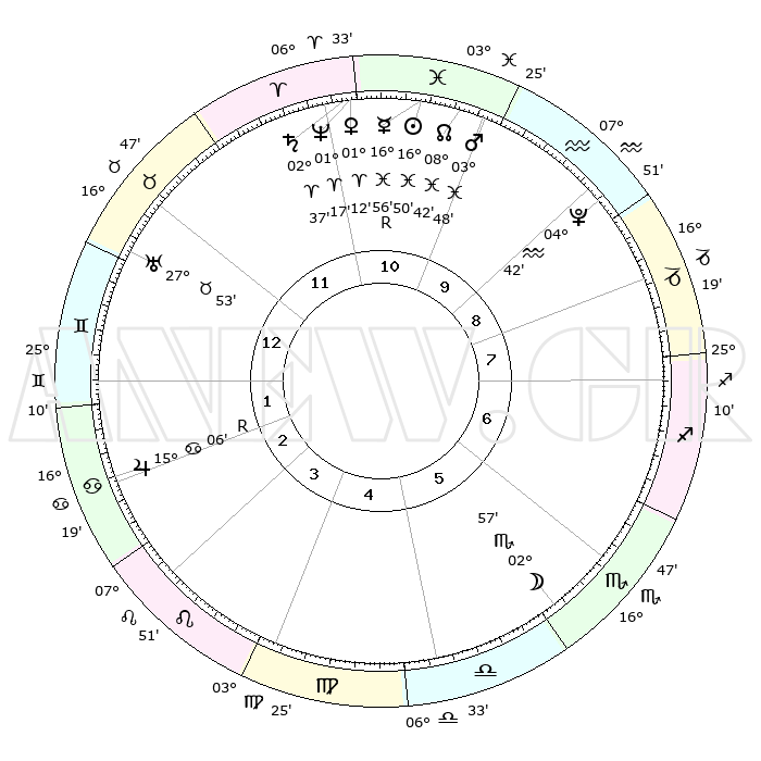 | | ΘΕΣΕΙΣ ΠΛΑΝΗΤΩΝ ΑΣΤΡΟΛΟΓΙΚΟΥ ΧΑΡΤΗ ΤΗΣ ΣΤΙΓΜΗΣ ΑΥΤΗΣ | | | | Πλανήτης | Ζώδιο | Μοίρες | Δεκαήμ. | Σε οίκο | Απόκλιση | | Ακμές των οίκων | | Ηλιος | Ιχθείς | 16°47' | Δεύτερο | 11 | 05 S 13 | | 1ος | 04°45' | Δίδυμοι | | Σελήνη | Σκορπιός | 02°17' | Πρώτο | 6 | 16 S 14 | | 2ος | 28°39' | Δίδυμοι | | Ερμής | Ιχθείς | 16°59'R | Δεύτερο | 11 | 01 S 47 | | 3ος | 19°56' | Καρκίνος | | Αφροδίτη | Κριός | 01°08' | Πρώτο | 11 | 00 S 41 | | 4ος | 13°04' | Λέων | | Αρης | Ιχθείς | 03°46' | Πρώτο | 10 | 11 S 09 | | 5ος | 12°23' | Παρθένος | | Δίας | Καρκίνος | 15°06'R | Δεύτερο | 2 | 22 N 56 | | 6ος | 21°30' | Ζυγός | | Κρόνος | Κριός | 02°36' | Πρώτο | 11 | 00 S 55 | | 7ος | 04°45' | Τοξότης | | Ουρανός | Ταύρος | 27°53' | Τρίτο | 12 | 19 N 31 | | 8ος | 28°39' | Τοξότης | | Ποσειδώνας | Κριός | 01°17' | Πρώτο | 11 | 00 S 41 | | 9ος | 19°56' | Αιγόκερως | | Πλούτωνας | Υδροχόος | 04°42' | Πρώτο | 9 | 22 S 51 | | 10ος | 13°04' | Υδροχόος | | Β. Δεσμός | Ιχθείς | 08°43' | Πρώτο | 10 | 08 S 18 | | 11ος | 12°23' | Ιχθείς | | Ωροσκόπος | Δίδυμοι | 04°45' | Πρώτο | | | 12ος | 21°30' | Κριός | | Μεσουράνημα | Υδροχόος | 13°04' | Δεύτερο | | | |