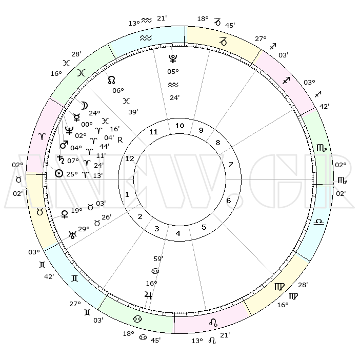| | ΘΕΣΕΙΣ ΠΛΑΝΗΤΩΝ ΑΣΤΡΟΛΟΓΙΚΟΥ ΧΑΡΤΗ ΤΗΣ ΣΤΙΓΜΗΣ ΑΥΤΗΣ | | | | Πλανήτης | Ζώδιο | Μοίρες | Δεκαήμ. | Σε οίκο | Απόκλιση | | Ακμές των οίκων | | Ηλιος | Κριός | 25°10' | Τρίτο | 1 | 09 N 44 | | 1ος | 26°43' | Ιχθείς | | Σελήνη | Ιχθείς | 23°25' | Τρίτο | 12 | 01 S 22 | | 2ος | 07°47' | Ταύρος | | Ερμής | Ιχθείς | 29°58' | Τρίτο | 1 | 02 S 23 | | 3ος | 05°42' | Δίδυμοι | | Αφροδίτη | Ταύρος | 18°58' | Δεύτερο | 2 | 17 N 38 | | 4ος | 28°09' | Δίδυμοι | | Αρης | Κριός | 04°08' | Πρώτο | 1 | 00 N 44 | | 5ος | 20°20' | Καρκίνος | | Δίας | Καρκίνος | 16°59' | Δεύτερο | 4 | 22 N 44 | | 6ος | 17°14' | Λέων | | Κρόνος | Κριός | 07°24' | Πρώτο | 1 | 00 N 58 | | 7ος | 26°43' | Παρθένος | | Ουρανός | Ταύρος | 29°26' | Τρίτο | 2 | 19 N 52 | | 8ος | 07°47' | Σκορπιός | | Ποσειδώνας | Κριός | 02°44' | Πρώτο | 1 | 00 S 07 | | 9ος | 05°42' | Τοξότης | | Πλούτωνας | Υδροχόος | 05°24' | Πρώτο | 11 | 22 S 47 | | 10ος | 28°09' | Τοξότης | | Β. Δεσμός | Ιχθείς | 06°39' | Πρώτο | 12 | 09 S 04 | | 11ος | 20°20' | Αιγόκερως | | Ωροσκόπος | Ιχθείς | 26°43' | Τρίτο | | | 12ος | 17°14' | Υδροχόος | | Μεσουράνημα | Τοξότης | 28°09' | Τρίτο | | | |