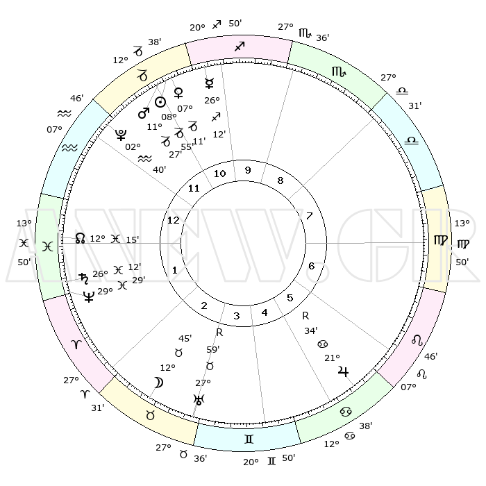 | | ΘΕΣΕΙΣ ΠΛΑΝΗΤΩΝ ΑΣΤΡΟΛΟΓΙΚΟΥ ΧΑΡΤΗ ΤΗΣ ΣΤΙΓΜΗΣ ΑΥΤΗΣ | | | | Πλανήτης | Ζώδιο | Μοίρες | Δεκαήμ. | Σε οίκο | Απόκλιση | | Ακμές των οίκων | | Ηλιος | Αιγόκερως | 08°51' | Πρώτο | 11 | 23 S 08 | | 1ος | 06°31' | Υδροχόος | | Σελήνη | Ταύρος | 11°42' | Δεύτερο | 3 | 19 N 32 | | 2ος | 21°33' | Ιχθείς | | Ερμής | Τοξότης | 26°05' | Τρίτο | 11 | 23 S 45 | | 3ος | 28°53' | Κριός | | Αφροδίτη | Αιγόκερως | 07°05' | Πρώτο | 11 | 23 S 41 | | 4ος | 26°16' | Ταύρος | | Αρης | Αιγόκερως | 11°24' | Δεύτερο | 12 | 23 S 49 | | 5ος | 18°37' | Δίδυμοι | | Δίας | Καρκίνος | 21°34'R | Τρίτο | 6 | 21 N 56 | | 6ος | 10°19' | Καρκίνος | | Κρόνος | Ιχθείς | 26°11' | Τρίτο | 2 | 03 S 36 | | 7ος | 06°31' | Λέων | | Ουρανός | Ταύρος | 27°60'R | Τρίτο | 4 | 19 N 31 | | 8ος | 21°33' | Παρθένος | | Ποσειδώνας | Ιχθείς | 29°29' | Τρίτο | 2 | 01 S 26 | | 9ος | 28°53' | Ζυγός | | Πλούτωνας | Υδροχόος | 02°40' | Πρώτο | 12 | 23 S 14 | | 10ος | 26°16' | Σκορπιός | | Β. Δεσμός | Ιχθείς | 12°16' | Δεύτερο | 1 | 06 S 58 | | 11ος | 18°37' | Τοξότης | | Ωροσκόπος | Υδροχόος | 06°31' | Πρώτο | | | 12ος | 10°19' | Αιγόκερως | | Μεσουράνημα | Σκορπιός | 26°16' | Τρίτο | | | |