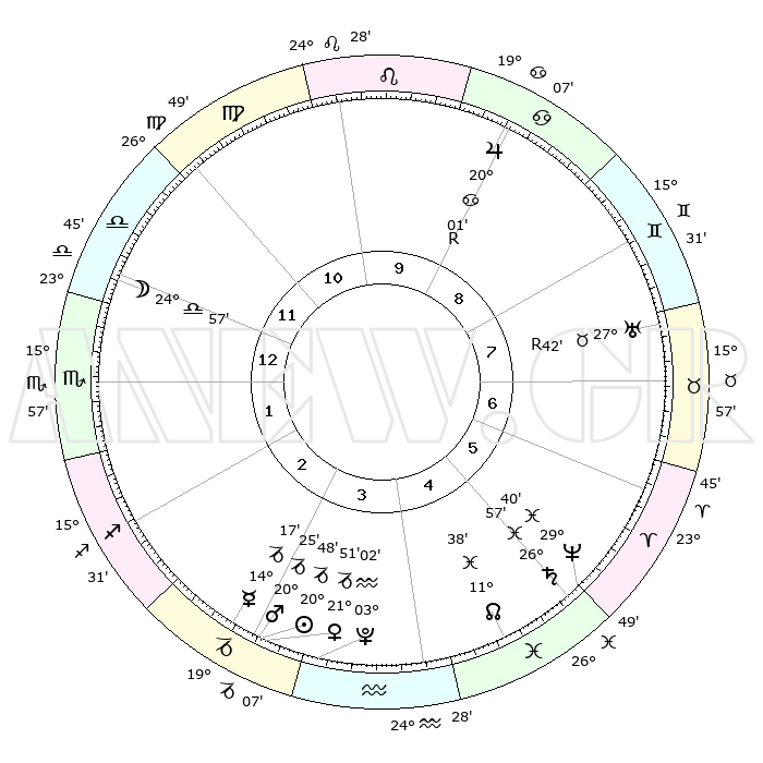 | | ΘΕΣΕΙΣ ΠΛΑΝΗΤΩΝ ΑΣΤΡΟΛΟΓΙΚΟΥ ΧΑΡΤΗ ΤΗΣ ΣΤΙΓΜΗΣ ΑΥΤΗΣ | | | | Πλανήτης | Ζώδιο | Μοίρες | Δεκαήμ. | Σε οίκο | Απόκλιση | | Ακμές των οίκων | | Ηλιος | Αιγόκερως | 20°10' | Τρίτο | 10 | 21 S 55 | | 1ος | 16°50' | Κριός | | Σελήνη | Ζυγός | 17°22' | Δεύτερο | 7 | 09 S 40 | | 2ος | 22°43' | Ταύρος | | Ερμής | Αιγόκερως | 13°17' | Δεύτερο | 10 | 24 S 14 | | 3ος | 17°46' | Δίδυμοι | | Αφροδίτη | Αιγόκερως | 21°03' | Τρίτο | 10 | 22 S 37 | | 4ος | 09°33' | Καρκίνος | | Αρης | Αιγόκερως | 19°56' | Δεύτερο | 10 | 22 S 53 | | 5ος | 02°50' | Λέων | | Δίας | Καρκίνος | 20°06'R | Τρίτο | 4 | 22 N 11 | | 6ος | 03°03' | Παρθένος | | Κρόνος | Ιχθείς | 26°54' | Τρίτο | 12 | 03 S 17 | | 7ος | 16°50' | Ζυγός | | Ουρανός | Ταύρος | 27°43'R | Τρίτο | 2 | 19 N 27 | | 8ος | 22°43' | Σκορπιός | | Ποσειδώνας | Ιχθείς | 29°39' | Τρίτο | 12 | 01 S 21 | | 9ος | 17°46' | Τοξότης | | Πλούτωνας | Υδροχόος | 03°01' | Πρώτο | 11 | 23 S 09 | | 10ος | 09°33' | Αιγόκερως | | Β. Δεσμός | Ιχθείς | 11°40' | Δεύτερο | 12 | 07 S 11 | | 11ος | 02°50' | Υδροχόος | | Ωροσκόπος | Κριός | 16°50' | Δεύτερο | | | 12ος | 03°03' | Ιχθείς | | Μεσουράνημα | Αιγόκερως | 09°33' | Πρώτο | | | |