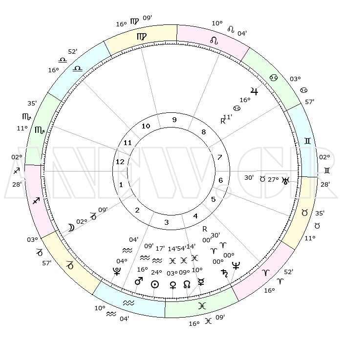 | | ΘΕΣΕΙΣ ΠΛΑΝΗΤΩΝ ΑΣΤΡΟΛΟΓΙΚΟΥ ΧΑΡΤΗ ΤΗΣ ΣΤΙΓΜΗΣ ΑΥΤΗΣ | | | | Πλανήτης | Ζώδιο | Μοίρες | Δεκαήμ. | Σε οίκο | Απόκλιση | | Ακμές των οίκων | | Ηλιος | Υδροχόος | 24°13' | Τρίτο | 4 | 13 S 27 | | 1ος | 11°29' | Σκορπιός | | Σελήνη | Αιγόκερως | 01°17' | Πρώτο | 2 | 28 S 18 | | 2ος | 10°40' | Τοξότης | | Ερμής | Ιχθείς | 10°07' | Δεύτερο | 4 | 08 S 08 | | 3ος | 13°44' | Αιγόκερως | | Αφροδίτη | Ιχθείς | 03°09' | Πρώτο | 4 | 11 S 43 | | 4ος | 18°45' | Υδροχόος | | Αρης | Υδροχόος | 16°06' | Δεύτερο | 3 | 17 S 02 | | 5ος | 21°22' | Ιχθείς | | Δίας | Καρκίνος | 16°11'R | Δεύτερο | 9 | 22 N 46 | | 6ος | 18°50' | Κριός | | Κρόνος | Ιχθείς | 29°60' | Τρίτο | 5 | 01 S 59 | | 7ος | 11°29' | Ταύρος | | Ουρανός | Ταύρος | 27°30' | Τρίτο | 7 | 19 N 25 | | 8ος | 10°40' | Δίδυμοι | | Ποσειδώνας | Κριός | 00°30' | Πρώτο | 5 | 01 S 00 | | 9ος | 13°44' | Καρκίνος | | Πλούτωνας | Υδροχόος | 04°04' | Πρώτο | 3 | 22 S 57 | | 10ος | 18°45' | Λέων | | Β. Δεσμός | Ιχθείς | 09°54' | Πρώτο | 4 | 07 S 51 | | 11ος | 21°22' | Παρθένος | | Ωροσκόπος | Σκορπιός | 11°29' | Δεύτερο | | | 12ος | 18°50' | Ζυγός | | Μεσουράνημα | Λέων | 18°45' | Δεύτερο | | | |