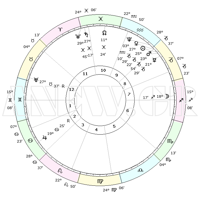 | | ΘΕΣΕΙΣ ΠΛΑΝΗΤΩΝ ΑΣΤΡΟΛΟΓΙΚΟΥ ΧΑΡΤΗ ΤΗΣ ΣΤΙΓΜΗΣ ΑΥΤΗΣ | | | | Πλανήτης | Ζώδιο | Μοίρες | Δεκαήμ. | Σε οίκο | Απόκλιση | | Ακμές των οίκων | | Ηλιος | Αιγόκερως | 25°17' | Τρίτο | 9 | 21 S 04 | | 1ος | 13°27' | Ταύρος | | Σελήνη | Τοξότης | 17°24' | Δεύτερο | 8 | 27 S 54 | | 2ος | 12°05' | Δίδυμοι | | Ερμής | Αιγόκερως | 21°22' | Τρίτο | 9 | 23 S 31 | | 3ος | 04°26' | Καρκίνος | | Αφροδίτη | Αιγόκερως | 27°23' | Τρίτο | 10 | 21 S 39 | | 4ος | 26°21' | Καρκίνος | | Αρης | Αιγόκερως | 23°50' | Τρίτο | 9 | 22 S 17 | | 5ος | 22°17' | Λέων | | Δίας | Καρκίνος | 19°25'R | Δεύτερο | 3 | 22 N 18 | | 6ος | 27°42' | Παρθένος | | Κρόνος | Ιχθείς | 27°17' | Τρίτο | 11 | 03 S 07 | | 7ος | 13°27' | Σκορπιός | | Ουρανός | Ταύρος | 27°37'R | Τρίτο | 1 | 19 N 26 | | 8ος | 12°05' | Τοξότης | | Ποσειδώνας | Ιχθείς | 29°45' | Τρίτο | 12 | 01 S 19 | | 9ος | 04°26' | Αιγόκερως | | Πλούτωνας | Υδροχόος | 03°10' | Πρώτο | 10 | 23 S 08 | | 10ος | 26°21' | Αιγόκερως | | Β. Δεσμός | Ιχθείς | 11°24' | Δεύτερο | 11 | 07 S 17 | | 11ος | 22°17' | Υδροχόος | | Ωροσκόπος | Ταύρος | 13°27' | Δεύτερο | | | 12ος | 27°42' | Ιχθείς | | Μεσουράνημα | Αιγόκερως | 26°21' | Τρίτο | | | |