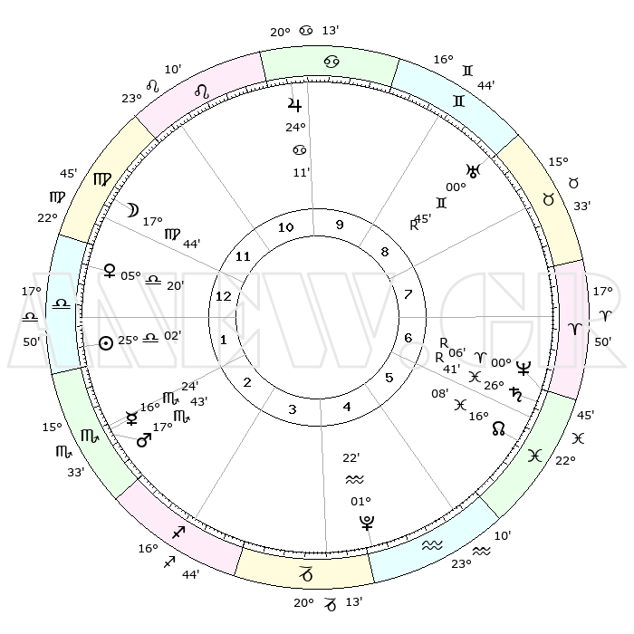 | ΘΕΣΕΙΣ ΠΛΑΝΗΤΩΝ ΑΣΤΡΟΛΟΓΙΚΟΥ ΧΑΡΤΗ ΤΗΣ ΣΤΙΓΜΗΣ ΑΥΤΗΣ | | Πλανήτης | Ζώδιο | Μοίρες | Δεκαήμ. | Σε οίκο | Απόκλιση | | Ακμές των οίκων | Ηλιος | Ζυγός | 24°39' | Τρίτο | 5 | 09 S 33 | | 1ος | 20°14' | Δίδυμοι | Σελήνη | Παρθένος | 12°52' | Δεύτερο | 4 | 07 N 10 | | 2ος | 11°51' | Καρκίνος | Ερμής | Σκορπιός | 15°52' | Δεύτερο | 6 | 18 S 31 | | 3ος | 03°11' | Λέων | Αφροδίτη | Ζυγός | 04°51' | Πρώτο | 5 | 00 S 31 | | 4ος | 28°03' | Λέων | Αρης | Σκορπιός | 17°26' | Δεύτερο | 6 | 17 S 16 | | 5ος | 00°17' | Ζυγός | Δίας | Καρκίνος | 24°09' | Τρίτο | 2 | 21 N 20 | | 6ος | 10°35' | Σκορπιός | Κρόνος | Ιχθείς | 26°42'R | Τρίτο | 10 | 03 S 36 | | 7ος | 20°14' | Τοξότης | Ουρανός | Δίδυμοι | 00°46'R | Πρώτο | 12 | 20 N 06 | | 8ος | 11°51' | Αιγόκερως | Ποσειδώνας | Κριός | 00°06'R | Πρώτο | 10 | 01 S 13 | | 9ος | 03°11' | Υδροχόος | Πλούτωνας | Υδροχόος | 01°22' | Πρώτο | 8 | 23 S 32 | | 10ος | 28°03' | Υδροχόος | Β. Δεσμός | Ιχθείς | 16°09' | Δεύτερο | 10 | 05 S 28 | | 11ος | 00°17' | Κριός | Ωροσκόπος | Δίδυμοι | 20°14' | Τρίτο | | | 12ος | 10°35' | Ταύρος | Μεσουράνημα | Υδροχόος | 28°03' | Τρίτο | | | |