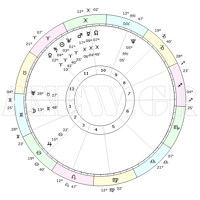 | | ΘΕΣΕΙΣ ΠΛΑΝΗΤΩΝ ΑΣΤΡΟΛΟΓΙΚΟΥ ΧΑΡΤΗ ΤΗΣ ΣΤΙΓΜΗΣ ΑΥΤΗΣ | | | | Πλανήτης | Ζώδιο | Μοίρες | Δεκαήμ. | Σε οίκο | Απόκλιση | | Ακμές των οίκων | | Ηλιος | Κριός | 03°36' | Πρώτο | 12 | 01 N 26 | | 1ος | 02°13' | Ταύρος | | Σελήνη | Δίδυμοι | 12°49' | Δεύτερο | 2 | 27 N 30 | | 2ος | 03°50' | Δίδυμοι | | Ερμής | Ιχθείς | 09°03' | Πρώτο | 11 | 08 S 00 | | 3ος | 27°10' | Δίδυμοι | | Αφροδίτη | Κριός | 22°04' | Τρίτο | 12 | 07 N 54 | | 4ος | 18°52' | Καρκίνος | | Αρης | Ιχθείς | 17°03' | Δεύτερο | 12 | 06 S 06 | | 5ος | 13°30' | Λέων | | Δίας | Καρκίνος | 15°22' | Δεύτερο | 3 | 22 N 55 | | 6ος | 16°39' | Παρθένος | | Κρόνος | Κριός | 04°42' | Πρώτο | 12 | 00 S 05 | | 7ος | 02°13' | Σκορπιός | | Ουρανός | Ταύρος | 28°27' | Τρίτο | 1 | 19 N 38 | | 8ος | 03°50' | Τοξότης | | Ποσειδώνας | Κριός | 01°55' | Πρώτο | 12 | 00 S 26 | | 9ος | 27°10' | Τοξότης | | Πλούτωνας | Υδροχόος | 05°05' | Πρώτο | 10 | 22 S 48 | | 10ος | 18°52' | Αιγόκερως | | Β. Δεσμός | Ιχθείς | 07°49' | Πρώτο | 11 | 08 S 38 | | 11ος | 13°30' | Υδροχόος | | Ωροσκόπος | Ταύρος | 02°13' | Πρώτο | | | 12ος | 16°39' | Ιχθείς | | Μεσουράνημα | Αιγόκερως | 18°52' | Δεύτερο | | | |