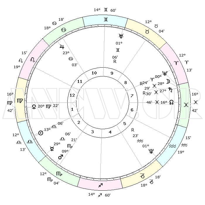 | ΘΕΣΕΙΣ ΠΛΑΝΗΤΩΝ ΑΣΤΡΟΛΟΓΙΚΟΥ ΧΑΡΤΗ ΤΗΣ ΣΤΙΓΜΗΣ ΑΥΤΗΣ | | Πλανήτης | Ζώδιο | Μοίρες | Δεκαήμ. | Σε οίκο | Απόκλιση | | Ακμές των οίκων | Ηλιος | Ζυγός | 13°00' | Δεύτερο | 3 | 05 S 08 | | 1ος | 19°58' | Λέων | Σελήνη | Ιχθείς | 27°09' | Τρίτο | 8 | 00 S 23 | | 2ος | 12°46' | Παρθένος | Ερμής | Ζυγός | 28°58' | Τρίτο | 3 | 11 S 46 | | 3ος | 10°25' | Ζυγός | Αφροδίτη | Παρθένος | 20°15' | Τρίτο | 2 | 05 N 08 | | 4ος | 13°05' | Σκορπιός | Αρης | Σκορπιός | 09°18' | Πρώτο | 3 | 14 S 43 | | 5ος | 17°59' | Τοξότης | Δίας | Καρκίνος | 23°03' | Τρίτο | 12 | 21 N 30 | | 6ος | 20°53' | Αιγόκερως | Κρόνος | Ιχθείς | 27°31'R | Τρίτο | 8 | 03 S 18 | | 7ος | 19°58' | Υδροχόος | Ουρανός | Δίδυμοι | 01°06'R | Πρώτο | 10 | 20 N 10 | | 8ος | 12°46' | Ιχθείς | Ποσειδώνας | Κριός | 00°25'R | Πρώτο | 8 | 01 S 06 | | 9ος | 10°25' | Κριός | Πλούτωνας | Υδροχόος | 01°23'R | Πρώτο | 6 | 23 S 32 | | 10ος | 13°05' | Ταύρος | Β. Δεσμός | Ιχθείς | 16°47' | Δεύτερο | 8 | 05 S 13 | | 11ος | 17°59' | Δίδυμοι | Ωροσκόπος | Λέων | 19°58' | Δεύτερο | | | 12ος | 20°53' | Καρκίνος | Μεσουράνημα | Ταύρος | 13°05' | Δεύτερο | | | |