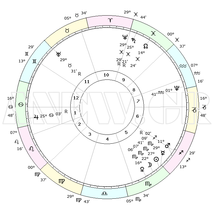 | | ΘΕΣΕΙΣ ΠΛΑΝΗΤΩΝ ΑΣΤΡΟΛΟΓΙΚΟΥ ΧΑΡΤΗ ΤΗΣ ΣΤΙΓΜΗΣ ΑΥΤΗΣ | | | | Πλανήτης | Ζώδιο | Μοίρες | Δεκαήμ. | Σε οίκο | Απόκλιση | | Ακμές των οίκων | | Ηλιος | Σκορπιός | 27°38' | Τρίτο | 6 | 19 S 38 | | 1ος | 29°42' | Δίδυμοι | | Σελήνη | Σκορπιός | 21°28' | Τρίτο | 5 | 22 S 32 | | 2ος | 20°31' | Καρκίνος | | Ερμής | Σκορπιός | 29°13'R | Τρίτο | 6 | 19 S 40 | | 3ος | 12°18' | Λέων | | Αφροδίτη | Σκορπιός | 16°02' | Δεύτερο | 5 | 15 S 36 | | 4ος | 08°34' | Παρθένος | | Αρης | Τοξότης | 10°60' | Δεύτερο | 6 | 22 S 39 | | 5ος | 12°28' | Ζυγός | | Δίας | Καρκίνος | 25°03'R | Τρίτο | 2 | 21 N 15 | | 6ος | 22°29' | Σκορπιός | | Κρόνος | Ιχθείς | 25°21'R | Τρίτο | 10 | 04 S 04 | | 7ος | 29°42' | Τοξότης | | Ουρανός | Ταύρος | 29°31'R | Τρίτο | 12 | 19 N 50 | | 8ος | 20°31' | Αιγόκερως | | Ποσειδώνας | Ιχθείς | 29°30'R | Τρίτο | 10 | 01 S 27 | | 9ος | 12°18' | Υδροχόος | | Πλούτωνας | Υδροχόος | 01°41' | Πρώτο | 8 | 23 S 27 | | 10ος | 08°34' | Ιχθείς | | Β. Δεσμός | Ιχθείς | 14°24' | Δεύτερο | 10 | 06 S 08 | | 11ος | 12°28' | Κριός | | Ωροσκόπος | Δίδυμοι | 29°42' | Τρίτο | | | 12ος | 22°29' | Ταύρος | | Μεσουράνημα | Ιχθείς | 08°34' | Πρώτο | | | |