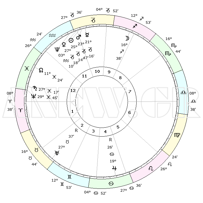 | | ΘΕΣΕΙΣ ΠΛΑΝΗΤΩΝ ΑΣΤΡΟΛΟΓΙΚΟΥ ΧΑΡΤΗ ΤΗΣ ΣΤΙΓΜΗΣ ΑΥΤΗΣ | | | | Πλανήτης | Ζώδιο | Μοίρες | Δεκαήμ. | Σε οίκο | Απόκλιση | | Ακμές των οίκων | | Ηλιος | Αιγόκερως | 25°09' | Τρίτο | 11 | 21 S 06 | | 1ος | 27°16' | Υδροχόος | | Σελήνη | Τοξότης | 15°46' | Δεύτερο | 10 | 27 S 45 | | 2ος | 12°52' | Κριός | | Ερμής | Αιγόκερως | 21°09' | Τρίτο | 11 | 23 S 33 | | 3ος | 16°08' | Ταύρος | | Αφροδίτη | Αιγόκερως | 27°13' | Τρίτο | 12 | 21 S 41 | | 4ος | 10°48' | Δίδυμοι | | Αρης | Αιγόκερως | 23°44' | Τρίτο | 11 | 22 S 18 | | 5ος | 02°31' | Καρκίνος | | Δίας | Καρκίνος | 19°26'R | Δεύτερο | 5 | 22 N 18 | | 6ος | 25°48' | Καρκίνος | | Κρόνος | Ιχθείς | 27°16' | Τρίτο | 1 | 03 S 07 | | 7ος | 27°16' | Λέων | | Ουρανός | Ταύρος | 27°38'R | Τρίτο | 3 | 19 N 26 | | 8ος | 12°52' | Ζυγός | | Ποσειδώνας | Ιχθείς | 29°45' | Τρίτο | 1 | 01 S 19 | | 9ος | 16°08' | Σκορπιός | | Πλούτωνας | Υδροχόος | 03°10' | Πρώτο | 12 | 23 S 08 | | 10ος | 10°48' | Τοξότης | | Β. Δεσμός | Ιχθείς | 11°25' | Δεύτερο | 1 | 07 S 17 | | 11ος | 02°31' | Αιγόκερως | | Ωροσκόπος | Υδροχόος | 27°16' | Τρίτο | | | 12ος | 25°48' | Αιγόκερως | | Μεσουράνημα | Τοξότης | 10°48' | Δεύτερο | | | |