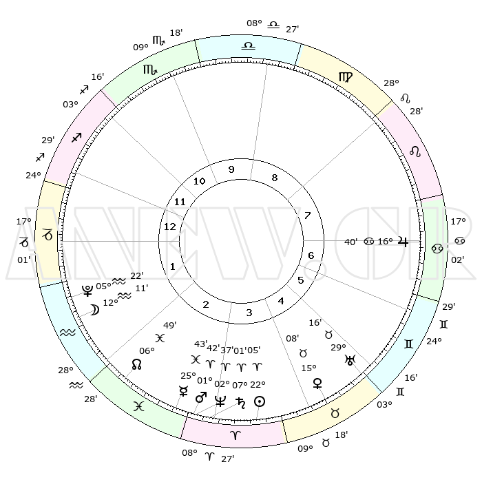 | | ΘΕΣΕΙΣ ΠΛΑΝΗΤΩΝ ΑΣΤΡΟΛΟΓΙΚΟΥ ΧΑΡΤΗ ΤΗΣ ΣΤΙΓΜΗΣ ΑΥΤΗΣ | | | | Πλανήτης | Ζώδιο | Μοίρες | Δεκαήμ. | Σε οίκο | Απόκλιση | | Ακμές των οίκων | | Ηλιος | Κριός | 22°02' | Τρίτο | 4 | 08 N 35 | | 1ος | 26°55' | Τοξότης | | Σελήνη | Υδροχόος | 11°27' | Δεύτερο | 2 | 19 S 34 | | 2ος | 03°18' | Υδροχόος | | Ερμής | Ιχθείς | 25°39' | Τρίτο | 3 | 03 S 59 | | 3ος | 13°03' | Ιχθείς | | Αφροδίτη | Ταύρος | 15°04' | Δεύτερο | 5 | 16 N 23 | | 4ος | 17°28' | Κριός | | Αρης | Κριός | 01°39' | Πρώτο | 3 | 00 S 16 | | 5ος | 14°16' | Ταύρος | | Δίας | Καρκίνος | 16°40' | Δεύτερο | 7 | 22 N 46 | | 6ος | 06°17' | Δίδυμοι | | Κρόνος | Κριός | 07°01' | Πρώτο | 3 | 00 N 49 | | 7ος | 26°55' | Δίδυμοι | | Ουρανός | Ταύρος | 29°16' | Τρίτο | 5 | 19 N 49 | | 8ος | 03°18' | Λέων | | Ποσειδώνας | Κριός | 02°37' | Πρώτο | 3 | 00 S 10 | | 9ος | 13°03' | Παρθένος | | Πλούτωνας | Υδροχόος | 05°22' | Πρώτο | 2 | 22 S 47 | | 10ος | 17°28' | Ζυγός | | Β. Δεσμός | Ιχθείς | 06°49' | Πρώτο | 2 | 09 S 00 | | 11ος | 14°16' | Σκορπιός | | Ωροσκόπος | Τοξότης | 26°55' | Τρίτο | | | 12ος | 06°17' | Τοξότης | | Μεσουράνημα | Ζυγός | 17°28' | Δεύτερο | | | |