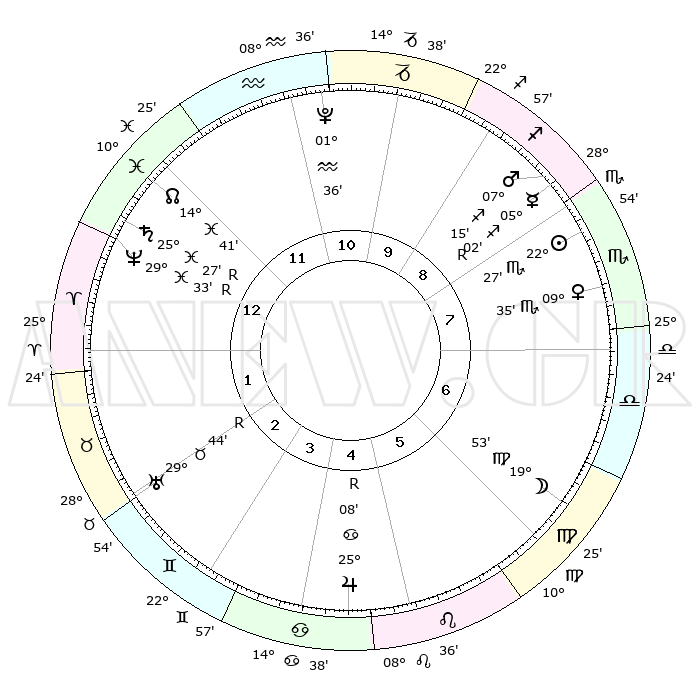 | | ΘΕΣΕΙΣ ΠΛΑΝΗΤΩΝ ΑΣΤΡΟΛΟΓΙΚΟΥ ΧΑΡΤΗ ΤΗΣ ΣΤΙΓΜΗΣ ΑΥΤΗΣ | | | | Πλανήτης | Ζώδιο | Μοίρες | Δεκαήμ. | Σε οίκο | Απόκλιση | | Ακμές των οίκων | | Ηλιος | Σκορπιός | 22°22' | Τρίτο | 8 | 18 S 21 | | 1ος | 07°12' | Ιχθείς | | Σελήνη | Παρθένος | 18°51' | Δεύτερο | 7 | 04 N 11 | | 2ος | 21°52' | Κριός | | Ερμής | Τοξότης | 05°05'R | Πρώτο | 9 | 22 S 29 | | 3ος | 23°11' | Ταύρος | | Αφροδίτη | Σκορπιός | 09°29' | Πρώτο | 8 | 13 S 29 | | 4ος | 16°56' | Δίδυμοι | | Αρης | Τοξότης | 07°11' | Πρώτο | 9 | 22 S 01 | | 5ος | 08°38' | Καρκίνος | | Δίας | Καρκίνος | 25°08'R | Τρίτο | 5 | 21 N 13 | | 6ος | 02°58' | Λέων | | Κρόνος | Ιχθείς | 25°27'R | Τρίτο | 1 | 04 S 02 | | 7ος | 07°12' | Παρθένος | | Ουρανός | Ταύρος | 29°44'R | Τρίτο | 3 | 19 N 53 | | 8ος | 21°52' | Ζυγός | | Ποσειδώνας | Ιχθείς | 29°33'R | Τρίτο | 1 | 01 S 26 | | 9ος | 23°11' | Σκορπιός | | Πλούτωνας | Υδροχόος | 01°36' | Πρώτο | 11 | 23 S 28 | | 10ος | 16°56' | Τοξότης | | Β. Δεσμός | Ιχθείς | 14°41' | Δεύτερο | 1 | 06 S 02 | | 11ος | 08°38' | Αιγόκερως | | Ωροσκόπος | Ιχθείς | 07°12' | Πρώτο | | | 12ος | 02°58' | Υδροχόος | | Μεσουράνημα | Τοξότης | 16°56' | Δεύτερο | | | |