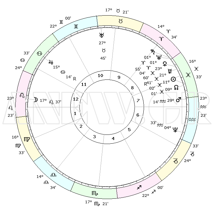 | | ΘΕΣΕΙΣ ΠΛΑΝΗΤΩΝ ΑΣΤΡΟΛΟΓΙΚΟΥ ΧΑΡΤΗ ΤΗΣ ΣΤΙΓΜΗΣ ΑΥΤΗΣ | | | | Πλανήτης | Ζώδιο | Μοίρες | Δεκαήμ. | Σε οίκο | Απόκλιση | | Ακμές των οίκων | | Ηλιος | Ιχθείς | 10°58' | Δεύτερο | 8 | 07 S 27 | | 1ος | 06°54' | Λέων | | Σελήνη | Λέων | 16°50' | Δεύτερο | 1 | 17 N 41 | | 2ος | 28°27' | Λέων | | Ερμής | Ιχθείς | 21°43'R | Τρίτο | 8 | 00 S 11 | | 3ος | 24°26' | Παρθένος | | Αφροδίτη | Ιχθείς | 23°55' | Τρίτο | 8 | 03 S 39 | | 4ος | 26°14' | Ζυγός | | Αρης | Υδροχόος | 29°12' | Τρίτο | 8 | 12 S 47 | | 5ος | 02°01' | Τοξότης | | Δίας | Καρκίνος | 15°14'R | Δεύτερο | 12 | 22 N 54 | | 6ος | 06°37' | Αιγόκερως | | Κρόνος | Κριός | 01°54' | Πρώτο | 9 | 01 S 12 | | 7ος | 06°54' | Υδροχόος | | Ουρανός | Ταύρος | 27°45' | Τρίτο | 10 | 19 N 29 | | 8ος | 28°27' | Υδροχόος | | Ποσειδώνας | Κριός | 01°04' | Πρώτο | 9 | 00 S 46 | | 9ος | 24°26' | Ιχθείς | | Πλούτωνας | Υδροχόος | 04°33' | Πρώτο | 6 | 22 S 52 | | 10ος | 26°14' | Κριός | | Β. Δεσμός | Ιχθείς | 09°01' | Πρώτο | 8 | 08 S 11 | | 11ος | 02°01' | Δίδυμοι | | Ωροσκόπος | Λέων | 06°54' | Πρώτο | | | 12ος | 06°37' | Καρκίνος | | Μεσουράνημα | Κριός | 26°14' | Τρίτο | | | |