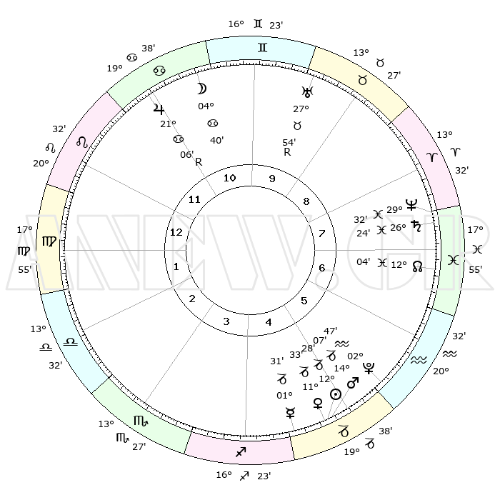 | | ΘΕΣΕΙΣ ΠΛΑΝΗΤΩΝ ΑΣΤΡΟΛΟΓΙΚΟΥ ΧΑΡΤΗ ΤΗΣ ΣΤΙΓΜΗΣ ΑΥΤΗΣ | | | | Πλανήτης | Ζώδιο | Μοίρες | Δεκαήμ. | Σε οίκο | Απόκλιση | | Ακμές των οίκων | | Ηλιος | Αιγόκερως | 12°23' | Δεύτερο | 5 | 22 S 51 | | 1ος | 25°35' | Λέων | | Σελήνη | Καρκίνος | 03°31' | Πρώτο | 11 | 28 N 03 | | 2ος | 18°59' | Παρθένος | | Ερμής | Αιγόκερως | 01°24' | Πρώτο | 5 | 24 S 11 | | 3ος | 17°14' | Ζυγός | | Αφροδίτη | Αιγόκερως | 11°28' | Δεύτερο | 5 | 23 S 30 | | 4ος | 20°04' | Σκορπιός | | Αρης | Αιγόκερως | 14°04' | Δεύτερο | 5 | 23 S 35 | | 5ος | 24°34' | Τοξότης | | Δίας | Καρκίνος | 21°07'R | Τρίτο | 11 | 22 N 01 | | 6ος | 26°54' | Αιγόκερως | | Κρόνος | Ιχθείς | 26°24' | Τρίτο | 8 | 03 S 30 | | 7ος | 25°35' | Υδροχόος | | Ουρανός | Ταύρος | 27°54'R | Τρίτο | 10 | 19 N 30 | | 8ος | 18°59' | Ιχθείς | | Ποσειδώνας | Ιχθείς | 29°32' | Τρίτο | 8 | 01 S 24 | | 9ος | 17°14' | Κριός | | Πλούτωνας | Υδροχόος | 02°47' | Πρώτο | 6 | 23 S 12 | | 10ος | 20°04' | Ταύρος | | Β. Δεσμός | Ιχθείς | 12°04' | Δεύτερο | 7 | 07 S 02 | | 11ος | 24°34' | Δίδυμοι | | Ωροσκόπος | Λέων | 25°35' | Τρίτο | | | 12ος | 26°54' | Καρκίνος | | Μεσουράνημα | Ταύρος | 20°04' | Τρίτο | | | |
