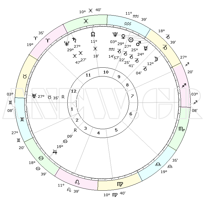 | | ΘΕΣΕΙΣ ΠΛΑΝΗΤΩΝ ΑΣΤΡΟΛΟΓΙΚΟΥ ΧΑΡΤΗ ΤΗΣ ΣΤΙΓΜΗΣ ΑΥΤΗΣ | | | | Πλανήτης | Ζώδιο | Μοίρες | Δεκαήμ. | Σε οίκο | Απόκλιση | | Ακμές των οίκων | | Ηλιος | Αιγόκερως | 27°17' | Τρίτο | 10 | 20 S 42 | | 1ος | 26°24' | Κριός | | Σελήνη | Αιγόκερως | 11°08' | Δεύτερο | 9 | 27 S 20 | | 2ος | 29°37' | Ταύρος | | Ερμής | Αιγόκερως | 24°34' | Τρίτο | 10 | 23 S 05 | | 3ος | 23°34' | Δίδυμοι | | Αφροδίτη | Αιγόκερως | 29°51' | Τρίτο | 10 | 21 S 12 | | 4ος | 15°15' | Καρκίνος | | Αρης | Αιγόκερως | 25°21' | Τρίτο | 10 | 22 S 02 | | 5ος | 09°18' | Λέων | | Δίας | Καρκίνος | 19°09'R | Δεύτερο | 4 | 22 N 20 | | 6ος | 11°19' | Παρθένος | | Κρόνος | Ιχθείς | 27°26' | Τρίτο | 12 | 03 S 03 | | 7ος | 26°24' | Ζυγός | | Ουρανός | Ταύρος | 27°35'R | Τρίτο | 1 | 19 N 26 | | 8ος | 29°37' | Σκορπιός | | Ποσειδώνας | Ιχθείς | 29°47' | Τρίτο | 12 | 01 S 18 | | 9ος | 23°34' | Τοξότης | | Πλούτωνας | Υδροχόος | 03°14' | Πρώτο | 10 | 23 S 07 | | 10ος | 15°15' | Αιγόκερως | | Β. Δεσμός | Ιχθείς | 11°18' | Δεύτερο | 11 | 07 S 20 | | 11ος | 09°18' | Υδροχόος | | Ωροσκόπος | Κριός | 26°24' | Τρίτο | | | 12ος | 11°19' | Ιχθείς | | Μεσουράνημα | Αιγόκερως | 15°15' | Δεύτερο | | | |