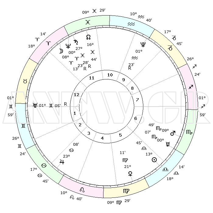 | ΘΕΣΕΙΣ ΠΛΑΝΗΤΩΝ ΑΣΤΡΟΛΟΓΙΚΟΥ ΧΑΡΤΗ ΤΗΣ ΣΤΙΓΜΗΣ ΑΥΤΗΣ | | Πλανήτης | Ζώδιο | Μοίρες | Δεκαήμ. | Σε οίκο | Απόκλιση | | Ακμές των οίκων | Ηλιος | Ζυγός | 13°39' | Δεύτερο | 6 | 05 S 23 | | 1ος | 14°39' | Κριός | Σελήνη | Κριός | 06°49' | Πρώτο | 12 | 04 N 14 | | 2ος | 21°08' | Ταύρος | Ερμής | Ζυγός | 29°58' | Τρίτο | 7 | 12 S 11 | | 3ος | 16°28' | Δίδυμοι | Αφροδίτη | Παρθένος | 21°04' | Τρίτο | 6 | 04 N 50 | | 4ος | 08°18' | Καρκίνος | Αρης | Σκορπιός | 09°45' | Πρώτο | 7 | 14 S 52 | | 5ος | 01°25' | Λέων | Δίας | Καρκίνος | 23°07' | Τρίτο | 4 | 21 N 29 | | 6ος | 01°15' | Παρθένος | Κρόνος | Ιχθείς | 27°28'R | Τρίτο | 12 | 03 S 19 | | 7ος | 14°39' | Ζυγός | Ουρανός | Δίδυμοι | 01°05'R | Πρώτο | 2 | 20 N 10 | | 8ος | 21°08' | Σκορπιός | Ποσειδώνας | Κριός | 00°24'R | Πρώτο | 12 | 01 S 06 | | 9ος | 16°28' | Τοξότης | Πλούτωνας | Υδροχόος | 01°23'R | Πρώτο | 10 | 23 S 32 | | 10ος | 08°18' | Αιγόκερως | Β. Δεσμός | Ιχθείς | 16°44' | Δεύτερο | 12 | 05 S 14 | | 11ος | 01°25' | Υδροχόος | Ωροσκόπος | Κριός | 14°39' | Δεύτερο | | | 12ος | 01°15' | Ιχθείς | Μεσουράνημα | Αιγόκερως | 08°18' | Πρώτο | | | |