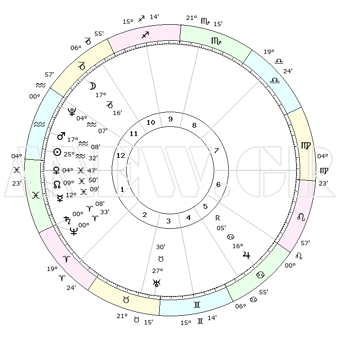 | | ΘΕΣΕΙΣ ΠΛΑΝΗΤΩΝ ΑΣΤΡΟΛΟΓΙΚΟΥ ΧΑΡΤΗ ΤΗΣ ΣΤΙΓΜΗΣ ΑΥΤΗΣ | | | | Πλανήτης | Ζώδιο | Μοίρες | Δεκαήμ. | Σε οίκο | Απόκλιση | | Ακμές των οίκων | | Ηλιος | Υδροχόος | 25°27' | Τρίτο | 1 | 13 S 02 | | 1ος | 20°28' | Αιγόκερως | | Σελήνη | Αιγόκερως | 16°06' | Δεύτερο | 12 | 26 S 38 | | 2ος | 02°42' | Ιχθείς | | Ερμής | Ιχθείς | 12°00' | Δεύτερο | 2 | 07 S 11 | | 3ος | 12°23' | Κριός | | Αφροδίτη | Ιχθείς | 04°40' | Πρώτο | 2 | 11 S 10 | | 4ος | 12°35' | Ταύρος | | Αρης | Υδροχόος | 17°03' | Δεύτερο | 1 | 16 S 45 | | 5ος | 06°11' | Δίδυμοι | | Δίας | Καρκίνος | 16°06'R | Δεύτερο | 6 | 22 N 47 | | 6ος | 27°24' | Δίδυμοι | | Κρόνος | Κριός | 00°08' | Πρώτο | 2 | 01 S 55 | | 7ος | 20°28' | Καρκίνος | | Ουρανός | Ταύρος | 27°30' | Τρίτο | 4 | 19 N 25 | | 8ος | 02°42' | Παρθένος | | Ποσειδώνας | Κριός | 00°32' | Πρώτο | 2 | 00 S 59 | | 9ος | 12°23' | Ζυγός | | Πλούτωνας | Υδροχόος | 04°07' | Πρώτο | 1 | 22 S 57 | | 10ος | 12°35' | Σκορπιός | | Β. Δεσμός | Ιχθείς | 09°50' | Πρώτο | 2 | 07 S 53 | | 11ος | 06°11' | Τοξότης | | Ωροσκόπος | Αιγόκερως | 20°28' | Τρίτο | | | 12ος | 27°24' | Τοξότης | | Μεσουράνημα | Σκορπιός | 12°35' | Δεύτερο | | | |