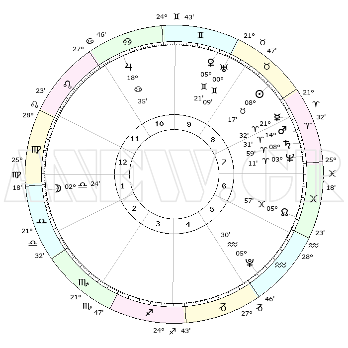 | | ΘΕΣΕΙΣ ΠΛΑΝΗΤΩΝ ΑΣΤΡΟΛΟΓΙΚΟΥ ΧΑΡΤΗ ΤΗΣ ΣΤΙΓΜΗΣ ΑΥΤΗΣ | | | | Πλανήτης | Ζώδιο | Μοίρες | Δεκαήμ. | Σε οίκο | Απόκλιση | | Ακμές των οίκων | | Ηλιος | Ταύρος | 08°14' | Πρώτο | 9 | 14 N 15 | | 1ος | 09°10' | Παρθένος | | Σελήνη | Ζυγός | 01°42' | Πρώτο | 1 | 02 S 36 | | 2ος | 03°58' | Ζυγός | | Ερμής | Κριός | 21°26' | Τρίτο | 8 | 06 N 20 | | 3ος | 03°22' | Σκορπιός | | Αφροδίτη | Δίδυμοι | 05°17' | Πρώτο | 9 | 21 N 57 | | 4ος | 06°19' | Τοξότης | | Αρης | Κριός | 14°29' | Δεύτερο | 8 | 04 N 52 | | 5ος | 09°57' | Αιγόκερως | | Δίας | Καρκίνος | 18°35' | Δεύτερο | 11 | 22 N 32 | | 6ος | 11°17' | Υδροχόος | | Κρόνος | Κριός | 08°59' | Πρώτο | 8 | 01 N 34 | | 7ος | 09°10' | Ιχθείς | | Ουρανός | Δίδυμοι | 00°08' | Πρώτο | 9 | 20 N 01 | | 8ος | 03°58' | Κριός | | Ποσειδώνας | Κριός | 03°11' | Πρώτο | 7 | 00 N 03 | | 9ος | 03°22' | Ταύρος | | Πλούτωνας | Υδροχόος | 05°30' | Πρώτο | 5 | 22 S 48 | | 10ος | 06°19' | Δίδυμοι | | Β. Δεσμός | Ιχθείς | 05°57' | Πρώτο | 6 | 09 S 20 | | 11ος | 09°57' | Καρκίνος | | Ωροσκόπος | Παρθένος | 09°10' | Πρώτο | | | 12ος | 11°17' | Λέων | | Μεσουράνημα | Δίδυμοι | 06°19' | Πρώτο | | | |