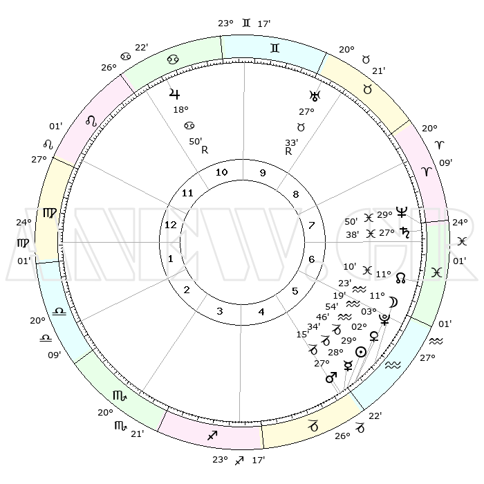 | | ΘΕΣΕΙΣ ΠΛΑΝΗΤΩΝ ΑΣΤΡΟΛΟΓΙΚΟΥ ΧΑΡΤΗ ΤΗΣ ΣΤΙΓΜΗΣ ΑΥΤΗΣ | | | | Πλανήτης | Ζώδιο | Μοίρες | Δεκαήμ. | Σε οίκο | Απόκλιση | | Ακμές των οίκων | | Ηλιος | Αιγόκερως | 29°41' | Τρίτο | 5 | 20 S 13 | | 1ος | 02°38' | Παρθένος | | Σελήνη | Υδροχόος | 10°28' | Δεύτερο | 6 | 20 S 01 | | 2ος | 26°45' | Παρθένος | | Ερμής | Αιγόκερως | 28°27' | Τρίτο | 5 | 22 S 26 | | 3ος | 25°39' | Ζυγός | | Αφροδίτη | Υδροχόος | 02°49' | Πρώτο | 5 | 20 S 36 | | 4ος | 28°36' | Σκορπιός | | Αρης | Αιγόκερως | 27°11' | Τρίτο | 5 | 21 S 41 | | 5ος | 02°37' | Αιγόκερως | | Δίας | Καρκίνος | 18°51'R | Δεύτερο | 11 | 22 N 23 | | 6ος | 04°22' | Υδροχόος | | Κρόνος | Ιχθείς | 27°38' | Τρίτο | 8 | 02 S 58 | | 7ος | 02°38' | Ιχθείς | | Ουρανός | Ταύρος | 27°33'R | Τρίτο | 9 | 19 N 25 | | 8ος | 26°45' | Ιχθείς | | Ποσειδώνας | Ιχθείς | 29°50' | Τρίτο | 8 | 01 S 17 | | 9ος | 25°39' | Κριός | | Πλούτωνας | Υδροχόος | 03°19' | Πρώτο | 5 | 23 S 06 | | 10ος | 28°36' | Ταύρος | | Β. Δεσμός | Ιχθείς | 11°11' | Δεύτερο | 7 | 07 S 22 | | 11ος | 02°37' | Καρκίνος | | Ωροσκόπος | Παρθένος | 02°38' | Πρώτο | | | 12ος | 04°22' | Λέων | | Μεσουράνημα | Ταύρος | 28°36' | Τρίτο | | | |