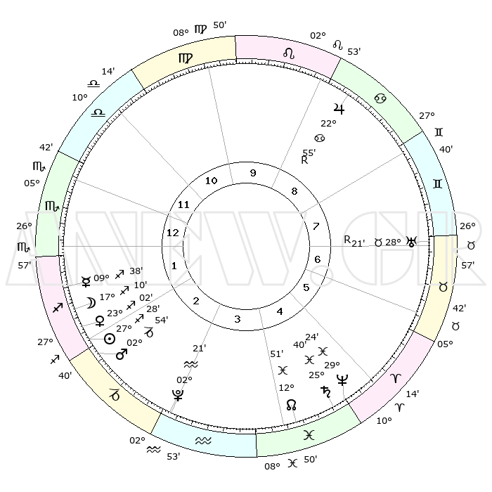 | | ΘΕΣΕΙΣ ΠΛΑΝΗΤΩΝ ΑΣΤΡΟΛΟΓΙΚΟΥ ΧΑΡΤΗ ΤΗΣ ΣΤΙΓΜΗΣ ΑΥΤΗΣ | | | | Πλανήτης | Ζώδιο | Μοίρες | Δεκαήμ. | Σε οίκο | Απόκλιση | | Ακμές των οίκων | | Ηλιος | Τοξότης | 27°05' | Τρίτο | 5 | 23 S 24 | | 1ος | 08°30' | Λέων | | Σελήνη | Τοξότης | 12°44' | Δεύτερο | 5 | 27 S 17 | | 2ος | 00°12' | Παρθένος | | Ερμής | Τοξότης | 09°06' | Πρώτο | 5 | 20 S 46 | | 3ος | 26°24' | Παρθένος | | Αφροδίτη | Τοξότης | 22°34' | Τρίτο | 5 | 23 S 13 | | 4ος | 28°20' | Ζυγός | | Αρης | Αιγόκερως | 02°37' | Πρώτο | 5 | 24 S 12 | | 5ος | 04°02' | Τοξότης | | Δίας | Καρκίνος | 22°58'R | Τρίτο | 12 | 21 N 41 | | 6ος | 08°24' | Αιγόκερως | | Κρόνος | Ιχθείς | 25°39' | Τρίτο | 8 | 03 S 51 | | 7ος | 08°30' | Υδροχόος | | Ουρανός | Ταύρος | 28°22'R | Τρίτο | 10 | 19 N 36 | | 8ος | 00°12' | Ιχθείς | | Ποσειδώνας | Ιχθείς | 29°24' | Τρίτο | 9 | 01 S 28 | | 9ος | 26°24' | Ιχθείς | | Πλούτωνας | Υδροχόος | 02°21' | Πρώτο | 6 | 23 S 18 | | 10ος | 28°20' | Κριός | | Β. Δεσμός | Ιχθείς | 12°52' | Δεύτερο | 8 | 06 S 44 | | 11ος | 04°02' | Δίδυμοι | | Ωροσκόπος | Λέων | 08°30' | Πρώτο | | | 12ος | 08°24' | Καρκίνος | | Μεσουράνημα | Κριός | 28°20' | Τρίτο | | | |