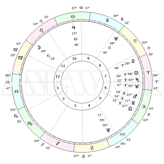 | | ΘΕΣΕΙΣ ΠΛΑΝΗΤΩΝ ΑΣΤΡΟΛΟΓΙΚΟΥ ΧΑΡΤΗ ΤΗΣ ΣΤΙΓΜΗΣ ΑΥΤΗΣ | | | | Πλανήτης | Ζώδιο | Μοίρες | Δεκαήμ. | Σε οίκο | Απόκλιση | | Ακμές των οίκων | | Ηλιος | Κριός | 08°56' | Πρώτο | 7 | 03 N 33 | | 1ος | 19°35' | Παρθένος | | Σελήνη | Λέων | 27°32' | Τρίτο | 12 | 13 N 17 | | 2ος | 15°21' | Ζυγός | | Ερμής | Ιχθείς | 11°52' | Δεύτερο | 6 | 07 S 57 | | 3ος | 15°20' | Σκορπιός | | Αφροδίτη | Κριός | 28°44' | Τρίτο | 8 | 10 N 31 | | 4ος | 18°16' | Τοξότης | | Αρης | Ιχθείς | 21°16' | Τρίτο | 7 | 04 S 26 | | 5ος | 21°28' | Αιγόκερως | | Δίας | Καρκίνος | 15°38' | Δεύτερο | 10 | 22 N 53 | | 6ος | 22°18' | Υδροχόος | | Κρόνος | Κριός | 05°22' | Πρώτο | 7 | 00 N 11 | | 7ος | 19°35' | Ιχθείς | | Ουρανός | Ταύρος | 28°40' | Τρίτο | 9 | 19 N 41 | | 8ος | 15°21' | Κριός | | Ποσειδώνας | Κριός | 02°07' | Πρώτο | 7 | 00 S 21 | | 9ος | 15°20' | Ταύρος | | Πλούτωνας | Υδροχόος | 05°11' | Πρώτο | 5 | 22 S 48 | | 10ος | 18°16' | Δίδυμοι | | Β. Δεσμός | Ιχθείς | 07°32' | Πρώτο | 6 | 08 S 45 | | 11ος | 21°28' | Καρκίνος | | Ωροσκόπος | Παρθένος | 19°35' | Δεύτερο | | | 12ος | 22°18' | Λέων | | Μεσουράνημα | Δίδυμοι | 18°16' | Δεύτερο | | | |
