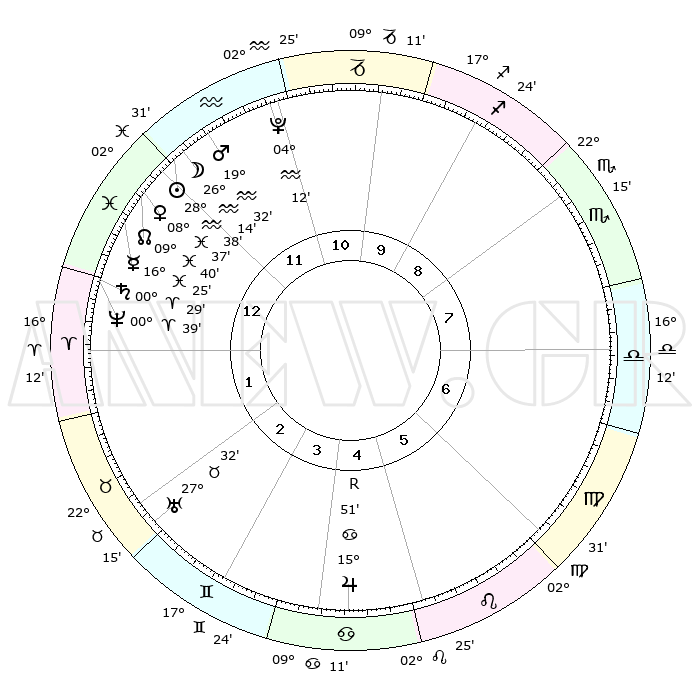 | | ΘΕΣΕΙΣ ΠΛΑΝΗΤΩΝ ΑΣΤΡΟΛΟΓΙΚΟΥ ΧΑΡΤΗ ΤΗΣ ΣΤΙΓΜΗΣ ΑΥΤΗΣ | | | | Πλανήτης | Ζώδιο | Μοίρες | Δεκαήμ. | Σε οίκο | Απόκλιση | | Ακμές των οίκων | | Ηλιος | Υδροχόος | 28°34' | Τρίτο | 12 | 11 S 58 | | 1ος | 07°47' | Ιχθείς | | Σελήνη | Υδροχόος | 25°22' | Τρίτο | 12 | 14 S 14 | | 2ος | 22°23' | Κριός | | Ερμής | Ιχθείς | 16°20' | Δεύτερο | 1 | 04 S 52 | | 3ος | 23°35' | Ταύρος | | Αφροδίτη | Ιχθείς | 08°32' | Πρώτο | 1 | 09 S 44 | | 4ος | 17°17' | Δίδυμοι | | Αρης | Υδροχόος | 19°29' | Δεύτερο | 12 | 16 S 00 | | 5ος | 08°59' | Καρκίνος | | Δίας | Καρκίνος | 15°52'R | Δεύτερο | 5 | 22 N 49 | | 6ος | 03°24' | Λέων | | Κρόνος | Κριός | 00°28' | Πρώτο | 1 | 01 S 47 | | 7ος | 07°47' | Παρθένος | | Ουρανός | Ταύρος | 27°32' | Τρίτο | 3 | 19 N 26 | | 8ος | 22°23' | Ζυγός | | Ποσειδώνας | Κριός | 00°38' | Πρώτο | 1 | 00 S 57 | | 9ος | 23°35' | Σκορπιός | | Πλούτωνας | Υδροχόος | 04°12' | Πρώτο | 12 | 22 S 56 | | 10ος | 17°17' | Τοξότης | | Β. Δεσμός | Ιχθείς | 09°40' | Πρώτο | 1 | 07 S 57 | | 11ος | 08°59' | Αιγόκερως | | Ωροσκόπος | Ιχθείς | 07°47' | Πρώτο | | | 12ος | 03°24' | Υδροχόος | | Μεσουράνημα | Τοξότης | 17°17' | Δεύτερο | | | |