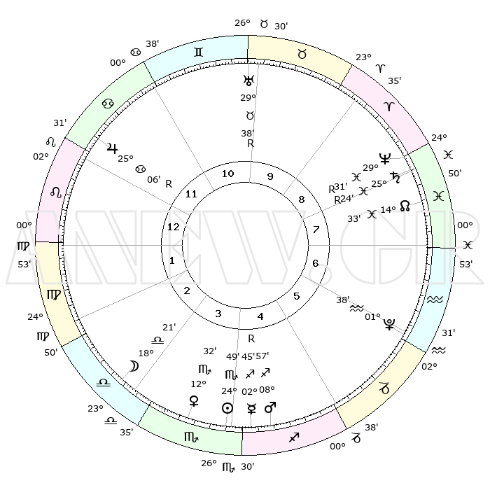 | | ΘΕΣΕΙΣ ΠΛΑΝΗΤΩΝ ΑΣΤΡΟΛΟΓΙΚΟΥ ΧΑΡΤΗ ΤΗΣ ΣΤΙΓΜΗΣ ΑΥΤΗΣ | | | | Πλανήτης | Ζώδιο | Μοίρες | Δεκαήμ. | Σε οίκο | Απόκλιση | | Ακμές των οίκων | | Ηλιος | Σκορπιός | 24°43' | Τρίτο | 4 | 18 S 57 | | 1ος | 02°17' | Λέων | | Σελήνη | Ζυγός | 17°10' | Δεύτερο | 3 | 09 S 09 | | 2ος | 23°29' | Λέων | | Ερμής | Τοξότης | 02°52'R | Πρώτο | 5 | 21 S 23 | | 3ος | 18°50' | Παρθένος | | Αφροδίτη | Σκορπιός | 12°24' | Δεύτερο | 4 | 14 S 27 | | 4ος | 20°09' | Ζυγός | | Αρης | Τοξότης | 08°53' | Πρώτο | 5 | 22 S 19 | | 5ος | 26°07' | Σκορπιός | | Δίας | Καρκίνος | 25°06'R | Τρίτο | 12 | 21 N 14 | | 6ος | 01°27' | Αιγόκερως | | Κρόνος | Ιχθείς | 25°24'R | Τρίτο | 9 | 04 S 03 | | 7ος | 02°17' | Υδροχόος | | Ουρανός | Ταύρος | 29°38'R | Τρίτο | 11 | 19 N 52 | | 8ος | 23°29' | Υδροχόος | | Ποσειδώνας | Ιχθείς | 29°32'R | Τρίτο | 9 | 01 S 26 | | 9ος | 18°50' | Ιχθείς | | Πλούτωνας | Υδροχόος | 01°38' | Πρώτο | 6 | 23 S 28 | | 10ος | 20°09' | Κριός | | Β. Δεσμός | Ιχθείς | 14°34' | Δεύτερο | 8 | 06 S 05 | | 11ος | 26°07' | Ταύρος | | Ωροσκόπος | Λέων | 02°17' | Πρώτο | | | 12ος | 01°27' | Καρκίνος | | Μεσουράνημα | Κριός | 20°09' | Τρίτο | | | |