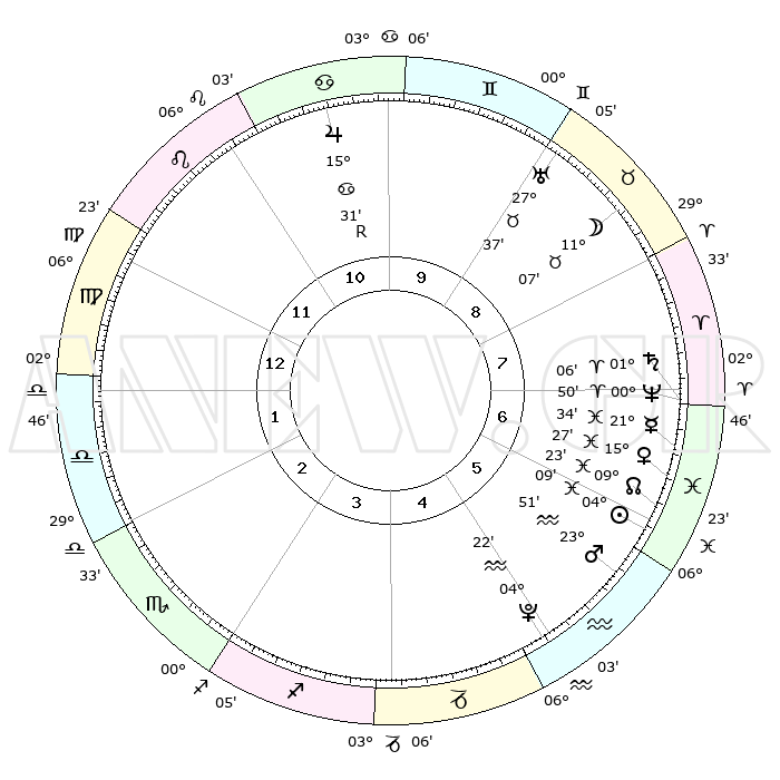 | | ΘΕΣΕΙΣ ΠΛΑΝΗΤΩΝ ΑΣΤΡΟΛΟΓΙΚΟΥ ΧΑΡΤΗ ΤΗΣ ΣΤΙΓΜΗΣ ΑΥΤΗΣ | | | | Πλανήτης | Ζώδιο | Μοίρες | Δεκαήμ. | Σε οίκο | Απόκλιση | | Ακμές των οίκων | | Ηλιος | Ιχθείς | 04°04' | Πρώτο | 6 | 10 S 01 | | 1ος | 10°17' | Παρθένος | | Σελήνη | Ταύρος | 10°02' | Δεύτερο | 9 | 19 N 12 | | 2ος | 05°11' | Ζυγός | | Ερμής | Ιχθείς | 21°31' | Τρίτο | 7 | 01 S 35 | | 3ος | 04°39' | Σκορπιός | | Αφροδίτη | Ιχθείς | 15°21' | Δεύτερο | 7 | 07 S 06 | | 4ος | 07°36' | Τοξότης | | Αρης | Υδροχόος | 23°47' | Τρίτο | 6 | 14 S 37 | | 5ος | 11°11' | Αιγόκερως | | Δίας | Καρκίνος | 15°31'R | Δεύτερο | 11 | 22 N 52 | | 6ος | 12°27' | Υδροχόος | | Κρόνος | Κριός | 01°06' | Πρώτο | 7 | 01 S 32 | | 7ος | 10°17' | Ιχθείς | | Ουρανός | Ταύρος | 27°37' | Τρίτο | 9 | 19 N 27 | | 8ος | 05°11' | Κριός | | Ποσειδώνας | Κριός | 00°50' | Πρώτο | 7 | 00 S 52 | | 9ος | 04°39' | Ταύρος | | Πλούτωνας | Υδροχόος | 04°22' | Πρώτο | 5 | 22 S 54 | | 10ος | 07°36' | Δίδυμοι | | Β. Δεσμός | Ιχθείς | 09°23' | Πρώτο | 6 | 08 S 03 | | 11ος | 11°11' | Καρκίνος | | Ωροσκόπος | Παρθένος | 10°17' | Δεύτερο | | | 12ος | 12°27' | Λέων | | Μεσουράνημα | Δίδυμοι | 07°36' | Πρώτο | | | |