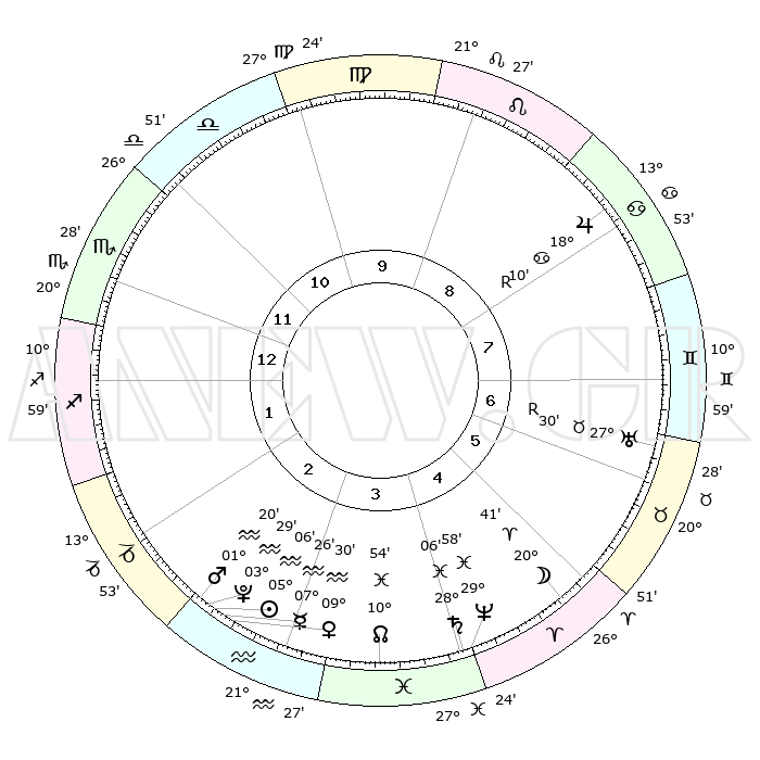 | | ΘΕΣΕΙΣ ΠΛΑΝΗΤΩΝ ΑΣΤΡΟΛΟΓΙΚΟΥ ΧΑΡΤΗ ΤΗΣ ΣΤΙΓΜΗΣ ΑΥΤΗΣ | | | | Πλανήτης | Ζώδιο | Μοίρες | Δεκαήμ. | Σε οίκο | Απόκλιση | | Ακμές των οίκων | | Ηλιος | Υδροχόος | 05°02' | Πρώτο | 3 | 19 S 00 | | 1ος | 19°47' | Σκορπιός | | Σελήνη | Κριός | 19°42' | Δεύτερο | 5 | 10 N 49 | | 2ος | 19°42' | Τοξότης | | Ερμής | Υδροχόος | 07°19' | Πρώτο | 3 | 20 S 27 | | 3ος | 23°50' | Αιγόκερως | | Αφροδίτη | Υδροχόος | 09°25' | Πρώτο | 3 | 19 S 05 | | 4ος | 29°25' | Υδροχόος | | Αρης | Υδροχόος | 01°17' | Πρώτο | 3 | 20 S 52 | | 5ος | 01°30' | Κριός | | Δίας | Καρκίνος | 18°11'R | Δεύτερο | 8 | 22 N 29 | | 6ος | 27°56' | Κριός | | Κρόνος | Ιχθείς | 28°06' | Τρίτο | 4 | 02 S 46 | | 7ος | 19°47' | Ταύρος | | Ουρανός | Ταύρος | 27°30'R | Τρίτο | 7 | 19 N 25 | | 8ος | 19°42' | Δίδυμοι | | Ποσειδώνας | Ιχθείς | 29°58' | Τρίτο | 4 | 01 S 14 | | 9ος | 23°50' | Καρκίνος | | Πλούτωνας | Υδροχόος | 03°29' | Πρώτο | 3 | 23 S 04 | | 10ος | 29°25' | Λέων | | Β. Δεσμός | Ιχθείς | 10°54' | Δεύτερο | 4 | 07 S 29 | | 11ος | 01°30' | Ζυγός | | Ωροσκόπος | Σκορπιός | 19°47' | Δεύτερο | | | 12ος | 27°56' | Ζυγός | | Μεσουράνημα | Λέων | 29°25' | Τρίτο | | | |