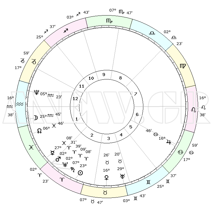 | | ΘΕΣΕΙΣ ΠΛΑΝΗΤΩΝ ΑΣΤΡΟΛΟΓΙΚΟΥ ΧΑΡΤΗ ΤΗΣ ΣΤΙΓΜΗΣ ΑΥΤΗΣ | | | | Πλανήτης | Ζώδιο | Μοίρες | Δεκαήμ. | Σε οίκο | Απόκλιση | | Ακμές των οίκων | | Ηλιος | Κριός | 23°04' | Τρίτο | 3 | 08 N 58 | | 1ος | 14°09' | Αιγόκερως | | Σελήνη | Υδροχόος | 24°46' | Τρίτο | 1 | 14 S 24 | | 2ος | 24°54' | Υδροχόος | | Ερμής | Ιχθείς | 27°02' | Τρίτο | 2 | 03 S 29 | | 3ος | 05°04' | Κριός | | Αφροδίτη | Ταύρος | 16°21' | Δεύτερο | 4 | 16 N 48 | | 4ος | 06°27' | Ταύρος | | Αρης | Κριός | 02°28' | Πρώτο | 2 | 00 N 04 | | 5ος | 00°46' | Δίδυμοι | | Δίας | Καρκίνος | 16°46' | Δεύτερο | 7 | 22 N 45 | | 6ος | 22°00' | Δίδυμοι | | Κρόνος | Κριός | 07°08' | Πρώτο | 3 | 00 N 52 | | 7ος | 14°09' | Καρκίνος | | Ουρανός | Ταύρος | 29°19' | Τρίτο | 4 | 19 N 50 | | 8ος | 24°54' | Λέων | | Ποσειδώνας | Κριός | 02°39' | Πρώτο | 2 | 00 S 09 | | 9ος | 05°04' | Ζυγός | | Πλούτωνας | Υδροχόος | 05°23' | Πρώτο | 1 | 22 S 47 | | 10ος | 06°27' | Σκορπιός | | Β. Δεσμός | Ιχθείς | 06°46' | Πρώτο | 2 | 09 S 01 | | 11ος | 00°46' | Τοξότης | | Ωροσκόπος | Αιγόκερως | 14°09' | Δεύτερο | | | 12ος | 22°00' | Τοξότης | | Μεσουράνημα | Σκορπιός | 06°27' | Πρώτο | | | |