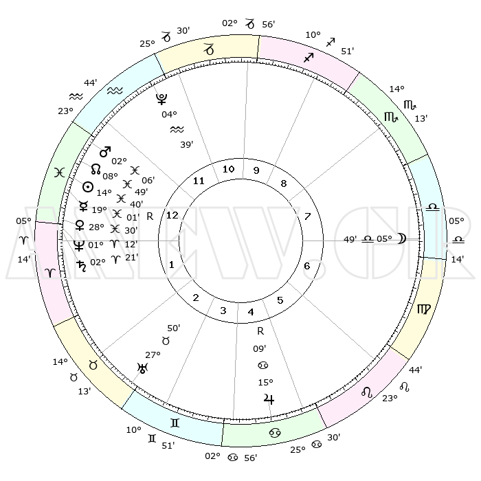 | | ΘΕΣΕΙΣ ΠΛΑΝΗΤΩΝ ΑΣΤΡΟΛΟΓΙΚΟΥ ΧΑΡΤΗ ΤΗΣ ΣΤΙΓΜΗΣ ΑΥΤΗΣ | | | | Πλανήτης | Ζώδιο | Μοίρες | Δεκαήμ. | Σε οίκο | Απόκλιση | | Ακμές των οίκων | | Ηλιος | Ιχθείς | 14°36' | Δεύτερο | 1 | 06 S 04 | | 1ος | 26°24' | Υδροχόος | | Σελήνη | Ζυγός | 04°57' | Πρώτο | 7 | 04 S 05 | | 2ος | 12°04' | Κριός | | Ερμής | Ιχθείς | 19°05'R | Δεύτερο | 1 | 00 S 56 | | 3ος | 15°29' | Ταύρος | | Αφροδίτη | Ιχθείς | 28°25' | Τρίτο | 1 | 01 S 48 | | 4ος | 10°15' | Δίδυμοι | | Αρης | Ιχθείς | 02°02' | Πρώτο | 1 | 11 S 46 | | 5ος | 01°58' | Καρκίνος | | Δίας | Καρκίνος | 15°09'R | Δεύτερο | 5 | 22 N 55 | | 6ος | 25°10' | Καρκίνος | | Κρόνος | Κριός | 02°20' | Πρώτο | 1 | 01 S 01 | | 7ος | 26°24' | Λέων | | Ουρανός | Ταύρος | 27°50' | Τρίτο | 3 | 19 N 30 | | 8ος | 12°04' | Ζυγός | | Ποσειδώνας | Κριός | 01°12' | Πρώτο | 1 | 00 S 43 | | 9ος | 15°29' | Σκορπιός | | Πλούτωνας | Υδροχόος | 04°39' | Πρώτο | 12 | 22 S 51 | | 10ος | 10°15' | Τοξότης | | Β. Δεσμός | Ιχθείς | 08°49' | Πρώτο | 1 | 08 S 16 | | 11ος | 01°58' | Αιγόκερως | | Ωροσκόπος | Υδροχόος | 26°24' | Τρίτο | | | 12ος | 25°10' | Αιγόκερως | | Μεσουράνημα | Τοξότης | 10°15' | Δεύτερο | | | |