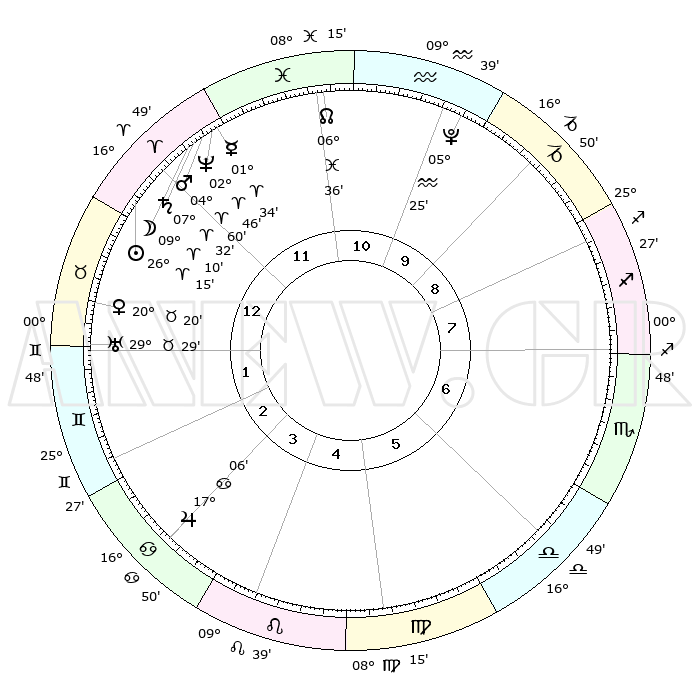 | | ΘΕΣΕΙΣ ΠΛΑΝΗΤΩΝ ΑΣΤΡΟΛΟΓΙΚΟΥ ΧΑΡΤΗ ΤΗΣ ΣΤΙΓΜΗΣ ΑΥΤΗΣ | | | | Πλανήτης | Ζώδιο | Μοίρες | Δεκαήμ. | Σε οίκο | Απόκλιση | | Ακμές των οίκων | | Ηλιος | Κριός | 26°11' | Τρίτο | 12 | 10 N 06 | | 1ος | 27°54' | Κριός | | Σελήνη | Κριός | 08°12' | Πρώτο | 12 | 05 N 37 | | 2ος | 00°42' | Δίδυμοι | | Ερμής | Κριός | 01°28' | Πρώτο | 12 | 01 S 49 | | 3ος | 24°29' | Δίδυμοι | | Αφροδίτη | Ταύρος | 20°15' | Τρίτο | 1 | 18 N 01 | | 4ος | 16°10' | Καρκίνος | | Αρης | Κριός | 04°57' | Πρώτο | 12 | 01 N 04 | | 5ος | 10°21' | Λέων | | Δίας | Καρκίνος | 17°05' | Δεύτερο | 4 | 22 N 43 | | 6ος | 12°40' | Παρθένος | | Κρόνος | Κριός | 07°32' | Πρώτο | 12 | 01 N 01 | | 7ος | 27°54' | Ζυγός | | Ουρανός | Ταύρος | 29°29' | Τρίτο | 1 | 19 N 52 | | 8ος | 00°42' | Τοξότης | | Ποσειδώνας | Κριός | 02°46' | Πρώτο | 12 | 00 S 06 | | 9ος | 24°29' | Τοξότης | | Πλούτωνας | Υδροχόος | 05°25' | Πρώτο | 10 | 22 S 47 | | 10ος | 16°10' | Αιγόκερως | | Β. Δεσμός | Ιχθείς | 06°36' | Πρώτο | 11 | 09 S 05 | | 11ος | 10°21' | Υδροχόος | | Ωροσκόπος | Κριός | 27°54' | Τρίτο | | | 12ος | 12°40' | Ιχθείς | | Μεσουράνημα | Αιγόκερως | 16°10' | Δεύτερο | | | |