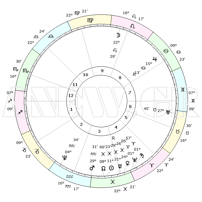 | | ΘΕΣΕΙΣ ΠΛΑΝΗΤΩΝ ΑΣΤΡΟΛΟΓΙΚΟΥ ΧΑΡΤΗ ΤΗΣ ΣΤΙΓΜΗΣ ΑΥΤΗΣ | | | | Πλανήτης | Ζώδιο | Μοίρες | Δεκαήμ. | Σε οίκο | Απόκλιση | | Ακμές των οίκων | | Ηλιος | Ιχθείς | 11°20' | Δεύτερο | 4 | 07 S 19 | | 1ος | 20°30' | Σκορπιός | | Σελήνη | Λέων | 21°42' | Τρίτο | 9 | 15 N 45 | | 2ος | 20°30' | Τοξότης | | Ερμής | Ιχθείς | 21°31'R | Τρίτο | 4 | 00 S 12 | | 3ος | 24°43' | Αιγόκερως | | Αφροδίτη | Ιχθείς | 24°22' | Τρίτο | 4 | 03 S 28 | | 4ος | 00°21' | Ιχθείς | | Αρης | Υδροχόος | 29°28' | Τρίτο | 3 | 12 S 41 | | 5ος | 02°23' | Κριός | | Δίας | Καρκίνος | 15°13'R | Δεύτερο | 8 | 22 N 54 | | 6ος | 28°43' | Κριός | | Κρόνος | Κριός | 01°57' | Πρώτο | 4 | 01 S 11 | | 7ος | 20°30' | Ταύρος | | Ουρανός | Ταύρος | 27°45' | Τρίτο | 7 | 19 N 29 | | 8ος | 20°30' | Δίδυμοι | | Ποσειδώνας | Κριός | 01°05' | Πρώτο | 4 | 00 S 46 | | 9ος | 24°43' | Καρκίνος | | Πλούτωνας | Υδροχόος | 04°34' | Πρώτο | 3 | 22 S 52 | | 10ος | 00°21' | Παρθένος | | Β. Δεσμός | Ιχθείς | 08°60' | Πρώτο | 4 | 08 S 12 | | 11ος | 02°23' | Ζυγός | | Ωροσκόπος | Σκορπιός | 20°30' | Τρίτο | | | 12ος | 28°43' | Ζυγός | | Μεσουράνημα | Παρθένος | 00°21' | Πρώτο | | | |