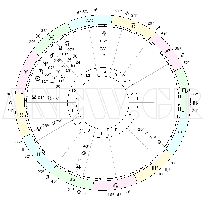 | | ΘΕΣΕΙΣ ΠΛΑΝΗΤΩΝ ΑΣΤΡΟΛΟΓΙΚΟΥ ΧΑΡΤΗ ΤΗΣ ΣΤΙΓΜΗΣ ΑΥΤΗΣ | | | | Πλανήτης | Ζώδιο | Μοίρες | Δεκαήμ. | Σε οίκο | Απόκλιση | | Ακμές των οίκων | | Ηλιος | Κριός | 11°27' | Δεύτερο | 1 | 04 N 32 | | 1ος | 04°29' | Κριός | | Σελήνη | Ζυγός | 00°36' | Πρώτο | 6 | 02 S 01 | | 2ος | 13°40' | Ταύρος | | Ερμής | Ιχθείς | 13°51' | Δεύτερο | 12 | 07 S 35 | | 3ος | 10°24' | Δίδυμοι | | Αφροδίτη | Ταύρος | 01°51' | Πρώτο | 1 | 11 N 42 | | 4ος | 02°31' | Καρκίνος | | Αρης | Ιχθείς | 23°15' | Τρίτο | 12 | 03 S 38 | | 5ος | 25°02' | Καρκίνος | | Δίας | Καρκίνος | 15°48' | Δεύτερο | 4 | 22 N 52 | | 6ος | 23°09' | Λέων | | Κρόνος | Κριός | 05°41' | Πρώτο | 1 | 00 N 18 | | 7ος | 04°29' | Ζυγός | | Ουρανός | Ταύρος | 28°46' | Τρίτο | 2 | 19 N 43 | | 8ος | 13°40' | Σκορπιός | | Ποσειδώνας | Κριός | 02°13' | Πρώτο | 12 | 00 S 19 | | 9ος | 10°24' | Τοξότης | | Πλούτωνας | Υδροχόος | 05°13' | Πρώτο | 11 | 22 S 47 | | 10ος | 02°31' | Αιγόκερως | | Β. Δεσμός | Ιχθείς | 07°24' | Πρώτο | 12 | 08 S 48 | | 11ος | 25°02' | Αιγόκερως | | Ωροσκόπος | Κριός | 04°29' | Πρώτο | | | 12ος | 23°09' | Υδροχόος | | Μεσουράνημα | Αιγόκερως | 02°31' | Πρώτο | | | |