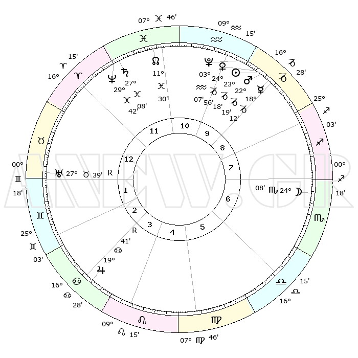 | | ΘΕΣΕΙΣ ΠΛΑΝΗΤΩΝ ΑΣΤΡΟΛΟΓΙΚΟΥ ΧΑΡΤΗ ΤΗΣ ΣΤΙΓΜΗΣ ΑΥΤΗΣ | | | | Πλανήτης | Ζώδιο | Μοίρες | Δεκαήμ. | Σε οίκο | Απόκλιση | | Ακμές των οίκων | | Ηλιος | Αιγόκερως | 23°13' | Τρίτο | 10 | 21 S 26 | | 1ος | 24°12' | Κριός | | Σελήνη | Σκορπιός | 23°15' | Τρίτο | 7 | 23 S 19 | | 2ος | 28°02' | Ταύρος | | Ερμής | Αιγόκερως | 18°05' | Δεύτερο | 10 | 23 S 53 | | 3ος | 22°13' | Δίδυμοι | | Αφροδίτη | Αιγόκερως | 24°50' | Τρίτο | 10 | 22 S 04 | | 4ος | 13°55' | Καρκίνος | | Αρης | Αιγόκερως | 22°16' | Τρίτο | 10 | 22 S 33 | | 5ος | 07°46' | Λέων | | Δίας | Καρκίνος | 19°42'R | Δεύτερο | 4 | 22 N 15 | | 6ος | 09°22' | Παρθένος | | Κρόνος | Ιχθείς | 27°07' | Τρίτο | 12 | 03 S 11 | | 7ος | 24°12' | Ζυγός | | Ουρανός | Ταύρος | 27°39'R | Τρίτο | 1 | 19 N 27 | | 8ος | 28°02' | Σκορπιός | | Ποσειδώνας | Ιχθείς | 29°42' | Τρίτο | 12 | 01 S 20 | | 9ος | 22°13' | Τοξότης | | Πλούτωνας | Υδροχόος | 03°06' | Πρώτο | 10 | 23 S 08 | | 10ος | 13°55' | Αιγόκερως | | Β. Δεσμός | Ιχθείς | 11°31' | Δεύτερο | 12 | 07 S 15 | | 11ος | 07°46' | Υδροχόος | | Ωροσκόπος | Κριός | 24°12' | Τρίτο | | | 12ος | 09°22' | Ιχθείς | | Μεσουράνημα | Αιγόκερως | 13°55' | Δεύτερο | | | |