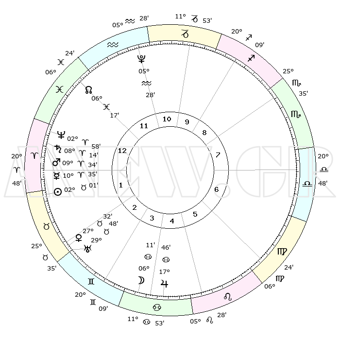 | | ΘΕΣΕΙΣ ΠΛΑΝΗΤΩΝ ΑΣΤΡΟΛΟΓΙΚΟΥ ΧΑΡΤΗ ΤΗΣ ΣΤΙΓΜΗΣ ΑΥΤΗΣ | | | | Πλανήτης | Ζώδιο | Μοίρες | Δεκαήμ. | Σε οίκο | Απόκλιση | | Ακμές των οίκων | | Ηλιος | Ταύρος | 01°57' | Πρώτο | 2 | 12 N 09 | | 1ος | 10°23' | Ιχθείς | | Σελήνη | Καρκίνος | 05°11' | Πρώτο | 4 | 27 N 51 | | 2ος | 24°37' | Κριός | | Ερμής | Κριός | 10°28' | Δεύτερο | 1 | 01 N 47 | | 3ος | 25°20' | Ταύρος | | Αφροδίτη | Ταύρος | 27°27' | Τρίτο | 3 | 20 N 04 | | 4ος | 18°49' | Δίδυμοι | | Αρης | Κριός | 09°31' | Πρώτο | 1 | 02 N 54 | | 5ος | 10°34' | Καρκίνος | | Δίας | Καρκίνος | 17°45' | Δεύτερο | 5 | 22 N 38 | | 6ος | 05°17' | Λέων | | Κρόνος | Κριός | 08°14' | Πρώτο | 1 | 01 N 17 | | 7ος | 10°23' | Παρθένος | | Ουρανός | Ταύρος | 29°47' | Τρίτο | 3 | 19 N 56 | | 8ος | 24°37' | Ζυγός | | Ποσειδώνας | Κριός | 02°58' | Πρώτο | 1 | 00 S 02 | | 9ος | 25°20' | Σκορπιός | | Πλούτωνας | Υδροχόος | 05°28' | Πρώτο | 12 | 22 S 48 | | 10ος | 18°49' | Τοξότης | | Β. Δεσμός | Ιχθείς | 06°17' | Πρώτο | 12 | 09 S 12 | | 11ος | 10°34' | Αιγόκερως | | Ωροσκόπος | Ιχθείς | 10°23' | Δεύτερο | | | 12ος | 05°16' | Υδροχόος | | Μεσουράνημα | Τοξότης | 18°49' | Δεύτερο | | | |