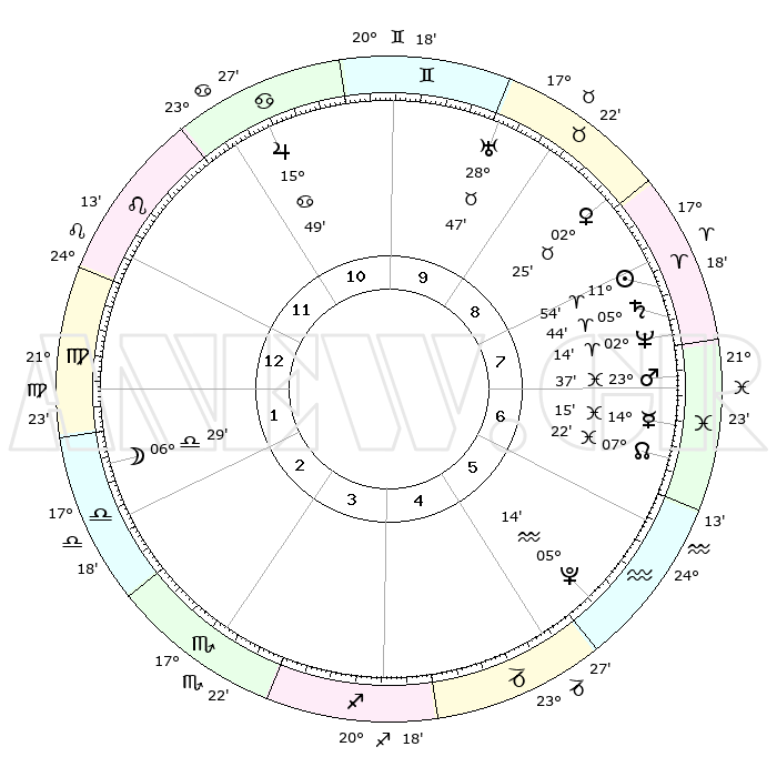 | | ΘΕΣΕΙΣ ΠΛΑΝΗΤΩΝ ΑΣΤΡΟΛΟΓΙΚΟΥ ΧΑΡΤΗ ΤΗΣ ΣΤΙΓΜΗΣ ΑΥΤΗΣ | | | | Πλανήτης | Ζώδιο | Μοίρες | Δεκαήμ. | Σε οίκο | Απόκλιση | | Ακμές των οίκων | | Ηλιος | Κριός | 11°51' | Δεύτερο | 8 | 04 N 41 | | 1ος | 04°40' | Παρθένος | | Σελήνη | Ζυγός | 05°46' | Πρώτο | 2 | 04 S 27 | | 2ος | 29°01' | Παρθένος | | Ερμής | Ιχθείς | 14°11' | Δεύτερο | 7 | 07 S 30 | | 3ος | 28°05' | Ζυγός | | Αφροδίτη | Ταύρος | 02°21' | Πρώτο | 9 | 11 N 54 | | 4ος | 01°02' | Τοξότης | | Αρης | Ιχθείς | 23°34' | Τρίτο | 7 | 03 S 30 | | 5ος | 04°55' | Αιγόκερως | | Δίας | Καρκίνος | 15°49' | Δεύτερο | 11 | 22 N 52 | | 6ος | 06°32' | Υδροχόος | | Κρόνος | Κριός | 05°44' | Πρώτο | 8 | 00 N 19 | | 7ος | 04°40' | Ιχθείς | | Ουρανός | Ταύρος | 28°47' | Τρίτο | 9 | 19 N 43 | | 8ος | 29°01' | Ιχθείς | | Ποσειδώνας | Κριός | 02°14' | Πρώτο | 8 | 00 S 19 | | 9ος | 28°05' | Κριός | | Πλούτωνας | Υδροχόος | 05°14' | Πρώτο | 5 | 22 S 47 | | 10ος | 01°02' | Δίδυμοι | | Β. Δεσμός | Ιχθείς | 07°22' | Πρώτο | 7 | 08 S 48 | | 11ος | 04°55' | Καρκίνος | | Ωροσκόπος | Παρθένος | 04°40' | Πρώτο | | | 12ος | 06°32' | Λέων | | Μεσουράνημα | Δίδυμοι | 01°02' | Πρώτο | | | |