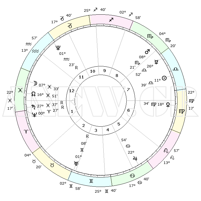 | ΘΕΣΕΙΣ ΠΛΑΝΗΤΩΝ ΑΣΤΡΟΛΟΓΙΚΟΥ ΧΑΡΤΗ ΤΗΣ ΣΤΙΓΜΗΣ ΑΥΤΗΣ | | Πλανήτης | Ζώδιο | Μοίρες | Δεκαήμ. | Σε οίκο | Απόκλιση | | Ακμές των οίκων | Ηλιος | Ζυγός | 11°32' | Δεύτερο | 8 | 04 S 34 | | 1ος | 22°57' | Αιγόκερως | Σελήνη | Ιχθείς | 05°54' | Πρώτο | 2 | 10 S 24 | | 2ος | 05°44' | Ιχθείς | Ερμής | Ζυγός | 26°41' | Τρίτο | 9 | 10 S 47 | | 3ος | 15°09' | Κριός | Αφροδίτη | Παρθένος | 18°25' | Δεύτερο | 8 | 05 N 50 | | 4ος | 14°52' | Ταύρος | Αρης | Σκορπιός | 08°16' | Πρώτο | 9 | 14 S 22 | | 5ος | 08°13' | Δίδυμοι | Δίας | Καρκίνος | 22°53' | Τρίτο | 6 | 21 N 31 | | 6ος | 29°28' | Δίδυμοι | Κρόνος | Ιχθείς | 27°38'R | Τρίτο | 2 | 03 S 15 | | 7ος | 22°57' | Καρκίνος | Ουρανός | Δίδυμοι | 01°08'R | Πρώτο | 4 | 20 N 10 | | 8ος | 05°44' | Παρθένος | Ποσειδώνας | Κριός | 00°27'R | Πρώτο | 2 | 01 S 05 | | 9ος | 15°09' | Ζυγός | Πλούτωνας | Υδροχόος | 01°23'R | Πρώτο | 1 | 23 S 32 | | 10ος | 14°52' | Σκορπιός | Β. Δεσμός | Ιχθείς | 16°51' | Δεύτερο | 2 | 05 S 11 | | 11ος | 08°13' | Τοξότης | Ωροσκόπος | Αιγόκερως | 22°57' | Τρίτο | | | 12ος | 29°28' | Τοξότης | Μεσουράνημα | Σκορπιός | 14°52' | Δεύτερο | | | |