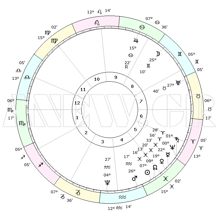 | | ΘΕΣΕΙΣ ΠΛΑΝΗΤΩΝ ΑΣΤΡΟΛΟΓΙΚΟΥ ΧΑΡΤΗ ΤΗΣ ΣΤΙΓΜΗΣ ΑΥΤΗΣ | | | | Πλανήτης | Ζώδιο | Μοίρες | Δεκαήμ. | Σε οίκο | Απόκλιση | | Ακμές των οίκων | | Ηλιος | Ιχθείς | 07°13' | Πρώτο | 5 | 08 S 52 | | 1ος | 19°17' | Ζυγός | | Σελήνη | Δίδυμοι | 24°20' | Τρίτο | 9 | 28 N 24 | | 2ος | 17°04' | Σκορπιός | | Ερμής | Ιχθείς | 22°33' | Τρίτο | 5 | 00 S 29 | | 3ος | 18°19' | Τοξότης | | Αφροδίτη | Ιχθείς | 19°15' | Δεύτερο | 5 | 05 S 33 | | 4ος | 21°53' | Αιγόκερως | | Αρης | Υδροχόος | 26°15' | Τρίτο | 5 | 13 S 48 | | 5ος | 24°50' | Υδροχόος | | Δίας | Καρκίνος | 15°22'R | Δεύτερο | 9 | 22 N 53 | | 6ος | 24°20' | Ιχθείς | | Κρόνος | Κριός | 01°28' | Πρώτο | 6 | 01 S 23 | | 7ος | 19°16' | Κριός | | Ουρανός | Ταύρος | 27°40' | Τρίτο | 8 | 19 N 27 | | 8ος | 17°04' | Ταύρος | | Ποσειδώνας | Κριός | 00°56' | Πρώτο | 6 | 00 S 50 | | 9ος | 18°20' | Δίδυμοι | | Πλούτωνας | Υδροχόος | 04°27' | Πρώτο | 4 | 22 S 53 | | 10ος | 21°53' | Καρκίνος | | Β. Δεσμός | Ιχθείς | 09°13' | Πρώτο | 5 | 08 S 07 | | 11ος | 24°50' | Λέων | | Ωροσκόπος | Ζυγός | 19°17' | Δεύτερο | | | 12ος | 24°20' | Παρθένος | | Μεσουράνημα | Καρκίνος | 21°53' | Τρίτο | | | |