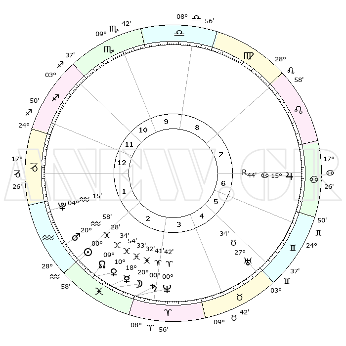 | | ΘΕΣΕΙΣ ΠΛΑΝΗΤΩΝ ΑΣΤΡΟΛΟΓΙΚΟΥ ΧΑΡΤΗ ΤΗΣ ΣΤΙΓΜΗΣ ΑΥΤΗΣ | | | | Πλανήτης | Ζώδιο | Μοίρες | Δεκαήμ. | Σε οίκο | Απόκλιση | | Ακμές των οίκων | | Ηλιος | Ιχθείς | 00°24' | Πρώτο | 2 | 11 S 20 | | 1ος | 22°35' | Τοξότης | | Σελήνη | Ιχθείς | 19°33' | Δεύτερο | 3 | 03 S 14 | | 2ος | 27°56' | Αιγόκερως | | Ερμής | Ιχθείς | 18°28' | Δεύτερο | 3 | 03 S 38 | | 3ος | 07°13' | Ιχθείς | | Αφροδίτη | Ιχθείς | 10°48' | Δεύτερο | 3 | 08 S 52 | | 4ος | 12°12' | Κριός | | Αρης | Υδροχόος | 20°55' | Τρίτο | 2 | 15 S 33 | | 5ος | 09°44' | Ταύρος | | Δίας | Καρκίνος | 15°44'R | Δεύτερο | 7 | 22 N 50 | | 6ος | 02°07' | Δίδυμοι | | Κρόνος | Κριός | 00°41' | Πρώτο | 3 | 01 S 42 | | 7ος | 22°35' | Δίδυμοι | | Ουρανός | Ταύρος | 27°33' | Τρίτο | 5 | 19 N 26 | | 8ος | 27°56' | Καρκίνος | | Ποσειδώνας | Κριός | 00°42' | Πρώτο | 3 | 00 S 55 | | 9ος | 07°13' | Παρθένος | | Πλούτωνας | Υδροχόος | 04°15' | Πρώτο | 2 | 22 S 55 | | 10ος | 12°12' | Ζυγός | | Β. Δεσμός | Ιχθείς | 09°34' | Πρώτο | 3 | 07 S 59 | | 11ος | 09°44' | Σκορπιός | | Ωροσκόπος | Τοξότης | 22°35' | Τρίτο | | | 12ος | 02°07' | Τοξότης | | Μεσουράνημα | Ζυγός | 12°12' | Δεύτερο | | | |