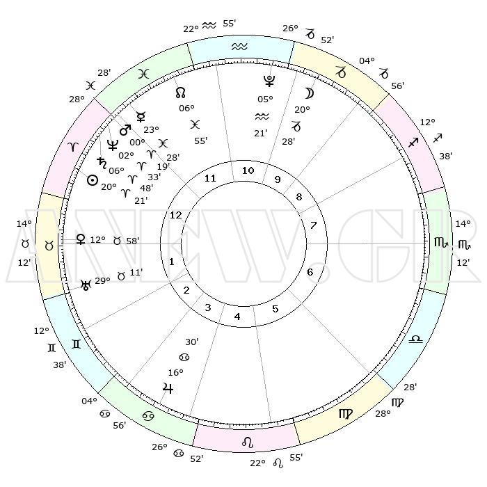 | | ΘΕΣΕΙΣ ΠΛΑΝΗΤΩΝ ΑΣΤΡΟΛΟΓΙΚΟΥ ΧΑΡΤΗ ΤΗΣ ΣΤΙΓΜΗΣ ΑΥΤΗΣ | | | | Πλανήτης | Ζώδιο | Μοίρες | Δεκαήμ. | Σε οίκο | Απόκλιση | | Ακμές των οίκων | | Ηλιος | Κριός | 20°17' | Τρίτο | 1 | 07 N 55 | | 1ος | 01°22' | Κριός | | Σελήνη | Αιγόκερως | 19°31' | Δεύτερο | 10 | 25 S 51 | | 2ος | 11°20' | Ταύρος | | Ερμής | Ιχθείς | 23°22' | Τρίτο | 12 | 04 S 47 | | 3ος | 08°31' | Δίδυμοι | | Αφροδίτη | Ταύρος | 12°52' | Δεύτερο | 2 | 15 N 39 | | 4ος | 00°46' | Καρκίνος | | Αρης | Κριός | 00°15' | Πρώτο | 12 | 00 S 49 | | 5ος | 23°08' | Καρκίνος | | Δίας | Καρκίνος | 16°30' | Δεύτερο | 4 | 22 N 47 | | 6ος | 20°45' | Λέων | | Κρόνος | Κριός | 06°47' | Πρώτο | 1 | 00 N 44 | | 7ος | 01°22' | Ζυγός | | Ουρανός | Ταύρος | 29°11' | Τρίτο | 2 | 19 N 48 | | 8ος | 11°19' | Σκορπιός | | Ποσειδώνας | Κριός | 02°33' | Πρώτο | 1 | 00 S 11 | | 9ος | 08°31' | Τοξότης | | Πλούτωνας | Υδροχόος | 05°21' | Πρώτο | 11 | 22 S 47 | | 10ος | 00°46' | Αιγόκερως | | Β. Δεσμός | Ιχθείς | 06°55' | Πρώτο | 12 | 08 S 58 | | 11ος | 23°08' | Αιγόκερως | | Ωροσκόπος | Κριός | 01°22' | Πρώτο | | | 12ος | 20°45' | Υδροχόος | | Μεσουράνημα | Αιγόκερως | 00°46' | Πρώτο | | | |