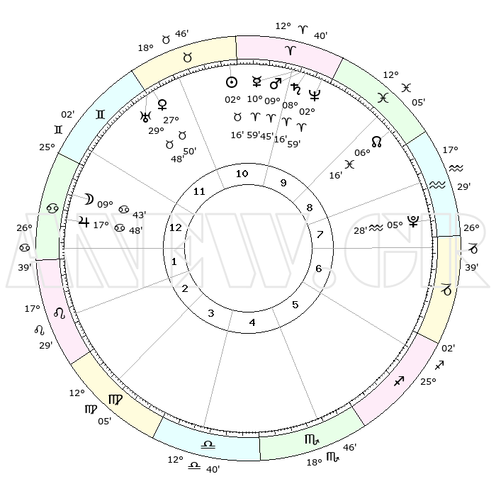 | | ΘΕΣΕΙΣ ΠΛΑΝΗΤΩΝ ΑΣΤΡΟΛΟΓΙΚΟΥ ΧΑΡΤΗ ΤΗΣ ΣΤΙΓΜΗΣ ΑΥΤΗΣ | | | | Πλανήτης | Ζώδιο | Μοίρες | Δεκαήμ. | Σε οίκο | Απόκλιση | | Ακμές των οίκων | | Ηλιος | Ταύρος | 02°13' | Πρώτο | 11 | 12 N 14 | | 1ος | 09°52' | Καρκίνος | | Σελήνη | Καρκίνος | 08°55' | Πρώτο | 12 | 27 N 28 | | 2ος | 00°18' | Λέων | | Ερμής | Κριός | 10°53' | Δεύτερο | 10 | 01 N 57 | | 3ος | 22°55' | Λέων | | Αφροδίτη | Ταύρος | 27°46' | Τρίτο | 11 | 20 N 09 | | 4ος | 20°51' | Παρθένος | | Αρης | Κριός | 09°43' | Πρώτο | 10 | 02 N 59 | | 5ος | 26°07' | Ζυγός | | Δίας | Καρκίνος | 17°47' | Δεύτερο | 1 | 22 N 38 | | 6ος | 05°05' | Τοξότης | | Κρόνος | Κριός | 08°16' | Πρώτο | 10 | 01 N 18 | | 7ος | 09°52' | Αιγόκερως | | Ουρανός | Ταύρος | 29°48' | Τρίτο | 11 | 19 N 56 | | 8ος | 00°18' | Υδροχόος | | Ποσειδώνας | Κριός | 02°59' | Πρώτο | 10 | 00 S 01 | | 9ος | 22°55' | Υδροχόος | | Πλούτωνας | Υδροχόος | 05°28' | Πρώτο | 8 | 22 S 48 | | 10ος | 20°51' | Ιχθείς | | Β. Δεσμός | Ιχθείς | 06°16' | Πρώτο | 9 | 09 S 12 | | 11ος | 26°07' | Κριός | | Ωροσκόπος | Καρκίνος | 09°52' | Πρώτο | | | 12ος | 05°05' | Δίδυμοι | | Μεσουράνημα | Ιχθείς | 20°51' | Τρίτο | | | |